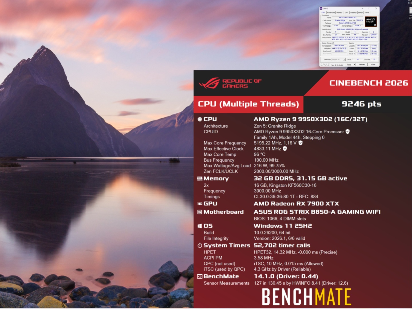 Beginnend met 7-Zip, rapporteerde de 9950X3D2 227.919 MIPS met de CPU op 5,13 GHz en 96 graden C. De Cinebench 2026 single-core score was 746 punten met een kloksnelheid van 5,4 GHz en een temperatuur van 76 graden Celsius. De score voor meerdere kernen op https://hwbot.org/benchmarks/cinebench_-_2026_multiple_threads/submissions/6005559 was 9.246 bij een temperatuur van 96 graden Celsius en een maximale kloksnelheid van 5,19 GHz. Tot slot was de Cinebench R23 Multi Core score was 38.579 punten bij 95 graden Celsius en een maximale kloksnelheid van 5,19 GHz. Qua stroomverbruik bereikte de Ryzen 9 9950X3D2 een maximum van 220W in de Cinebench R23 test. Het CPU-Z venster toont 200W TDP voor de CPU, wat in lijn is met AMD's rating.