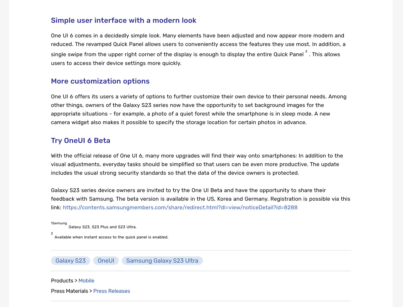 Samsung start zijn volgende One UI Beta campagne met de Galaxy S23, Galaxy S23 Plus en Galaxy S23 Ultramaar niet de nieuwere Galaxy Z Flip5 of Galaxy Z Fold5. Volgens het inmiddels verwijderde persbericht zal One UI 6 Beta van start gaan in Duitsland, Zuid-Korea en de VS voordat het naar andere markten wordt verplaatst. Zoals gebruikelijk zal het mogelijk zijn om je in te schrijven voor het One UI Beta programma via de Samsung Members app, mits je de link opent op een toestel uit de Galaxy S23-serie in een van de deelnemende landen.