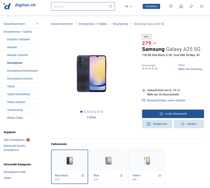 Zoals de schermafbeelding hieronder laat zien, heeft Digitec Galaxus AG (Digitec) het nog niet uitgebrachte toestel in zwart, blauw en geel weergegeven. Hoewel dit overeenkomt met eerdere lekken, lijkt het erop dat Samsung ook een vierde groene optie heeft voorbereid voor andere markten. Op basis van de drie vermeldingen op Digitec geldt de prijs van de Galaxy A25 5G volgens geruchten voor CHF 279 (~$ 318) voor het instapmodel met 6 GB RAM en 128 GB opslagruimte. Er zou echter ook een 256 GB opslagvariant moeten zijn met 8 GB RAM.