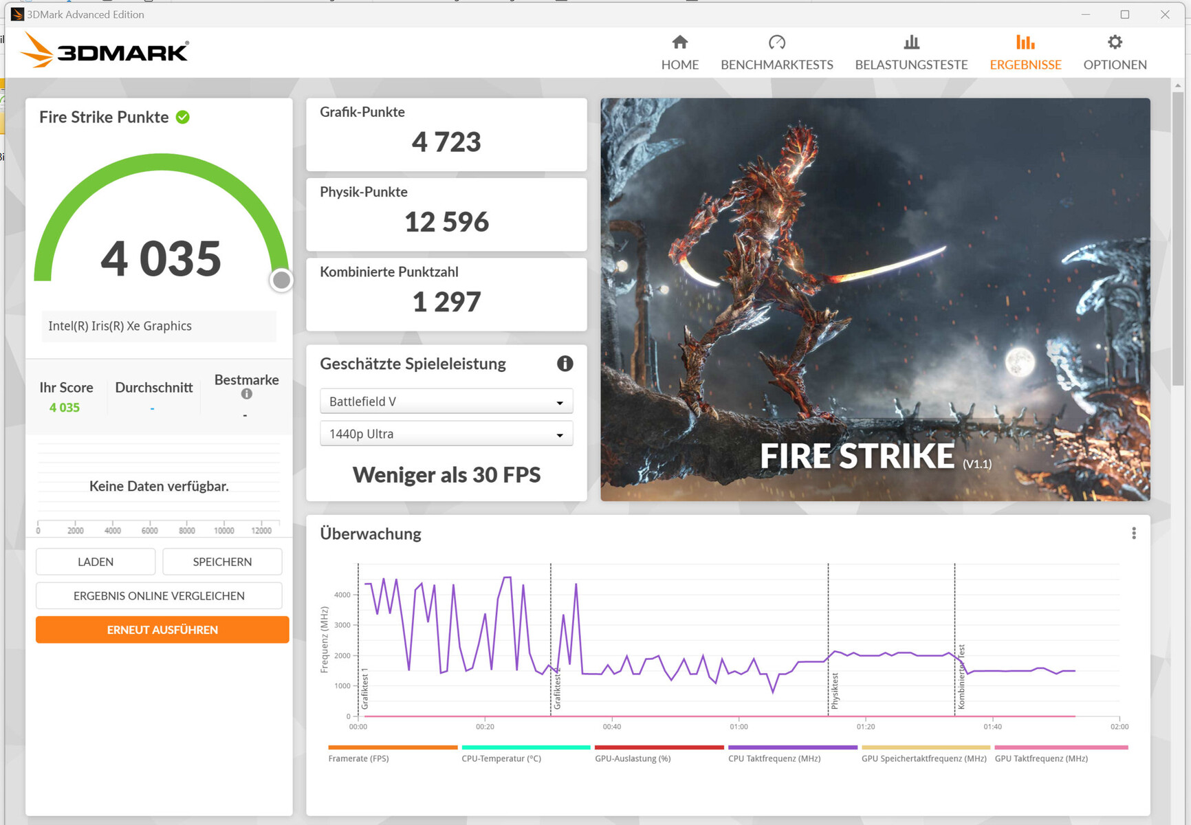 De stresstest (waarbij Prime95 en Furmark constant draaien) vormt een extreem scenario om de stabiliteit van het systeem onder volledige belasting te evalueren. In het begin van de test ligt de CPU-snelheid ongeveer op het niveau van de basiskloksnelheid (P: 2,2 tot 2,4 GHz; E: 2 GHz) en de grafische snelheid rond de 1.250 MHz. Gedurende de test dalen de waarden.