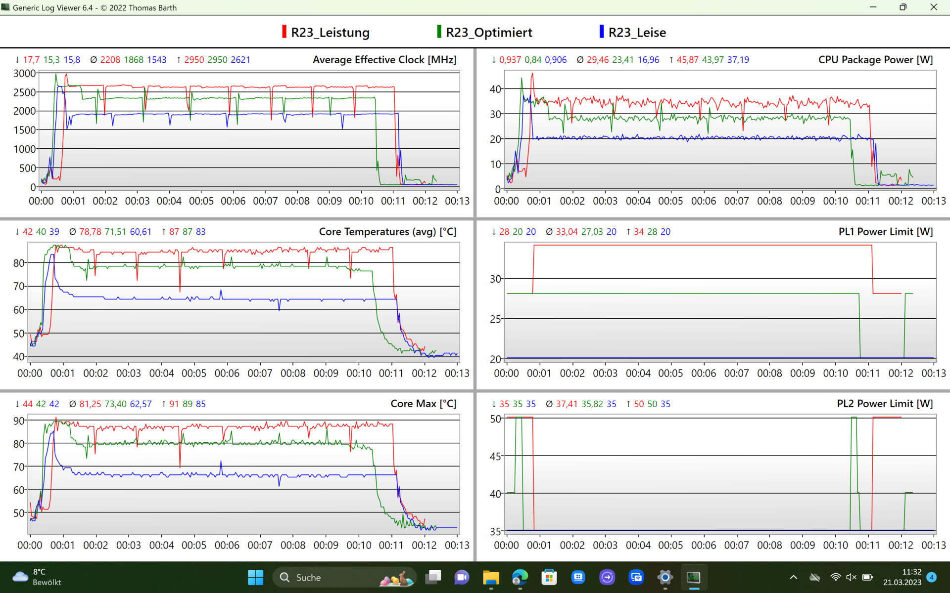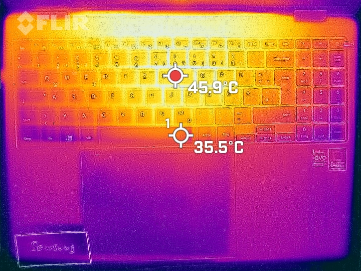 In de stresstest onderwerpen we onze testtoestellen gedurende een uur aan Prime95 en FurMark. De Galaxy Book3 kon zijn prestaties gedurende de hele stresstest handhaven. De kerntemperaturen kwamen niet boven de 81°C uit. We merkten alleen een afwijking in de batterijspanning, die tijdens de test van een uur met 0,5 volt daalde. Dit zou erop kunnen wijzen dat de voeding niet voldoende belast is.