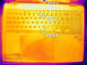 (+) Bij onbelast gebruik bedraagt de gemiddelde temperatuur voor de bovenzijde 25.5 °C / 78 F, vergeleken met het apparaatgemiddelde van 30.3 °C / 87 F.