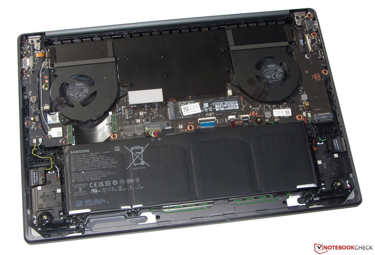 De demontage van het bodemdeksel vereist het verwijderen van alle schroeven die verborgen zitten onder de vier rubberen voetjes (geplaatst, niet gelijmd). Daarna moet u voorzichtig (!) te werk gaan bij het verwijderen van het bodemdeksel, dat erg strak zit en beschadigd kan worden. Wij raden aan een platte spatel te gebruiken. Daarna zijn de SSD (PCIe 4, M.2-2280), het tweede SSD-slot, de ventilatoren, de luidsprekers en de batterij toegankelijk.