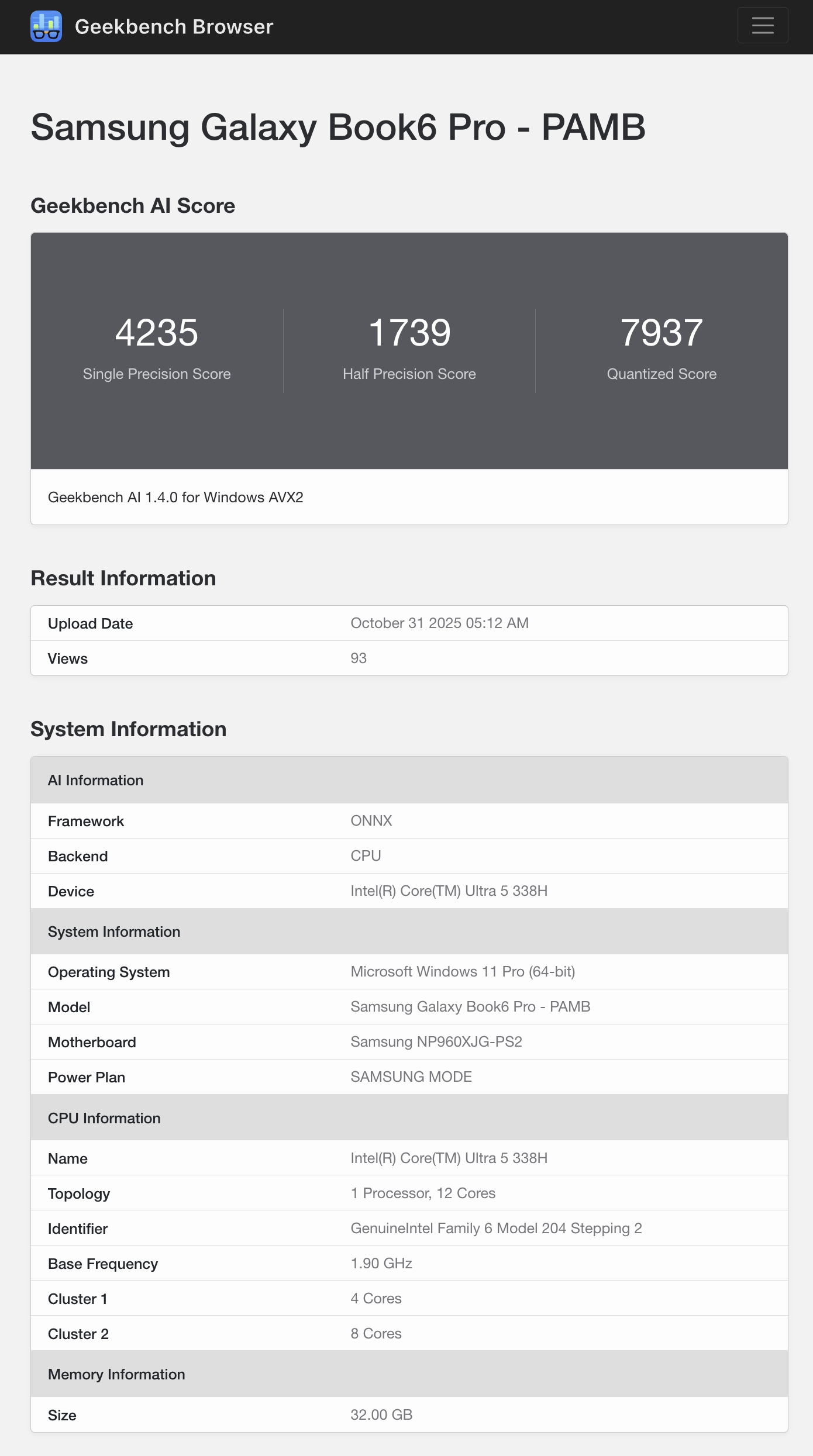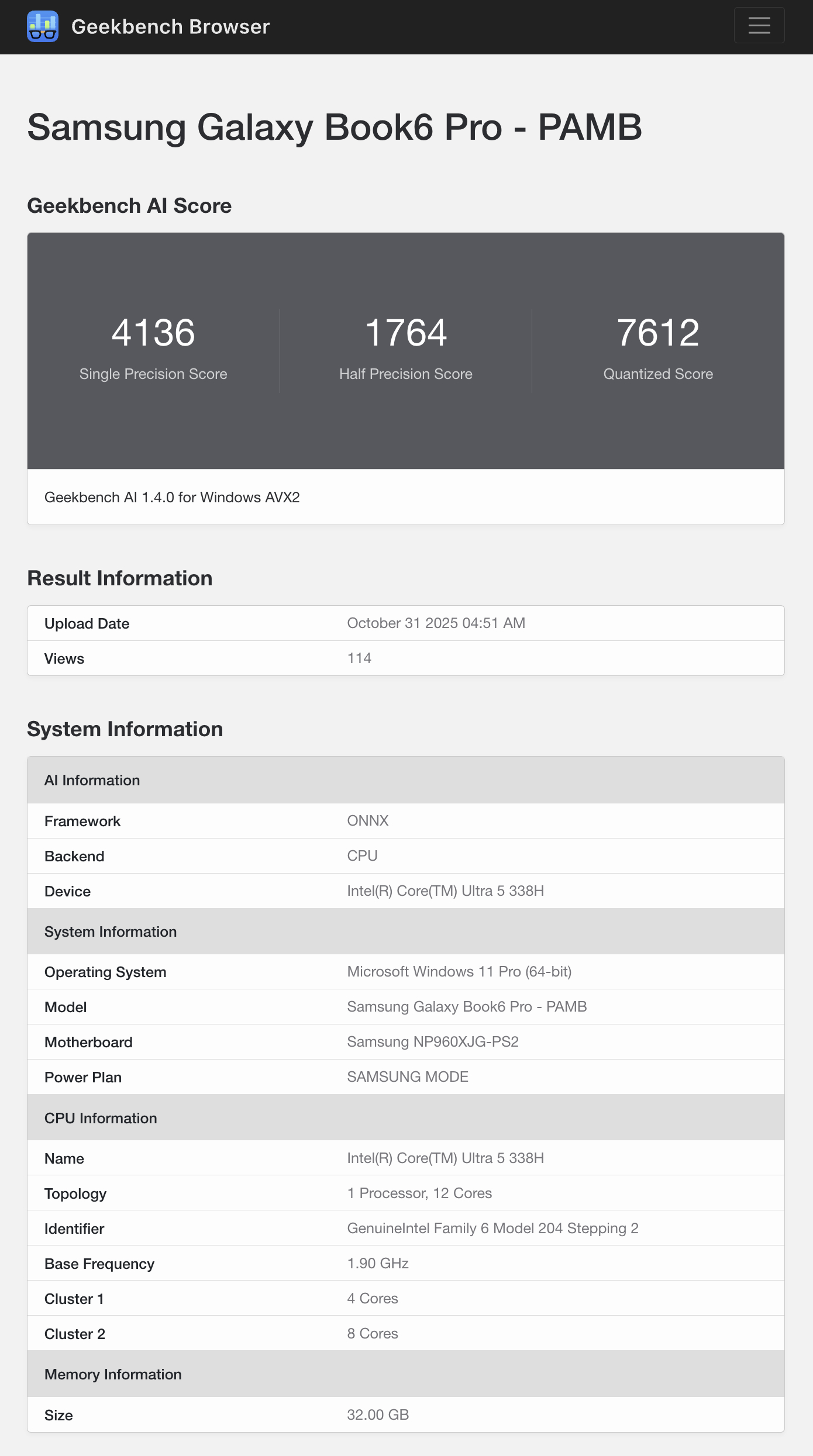 Blijkbaar zullen deze architecturale en productieverbeteringen ook de prestaties verbeteren, wat buiten de GPU-zware taken niet de sterkste kant van Lunar Lake is. In dat opzicht presteert de Core Ultra 5 338H gemakkelijk beter dan zelfs de Core Ultra 9 288V in de Geekbench AI 1.4.0 benchmark, deels geholpen door de 32 GB RAM die ook aanwezig is. Gebaseerd op recente lekkenzou een CPU-verbetering ook gepaard moeten gaan met GPU-verbetering dankzij Intels Xe3 iGPU's.