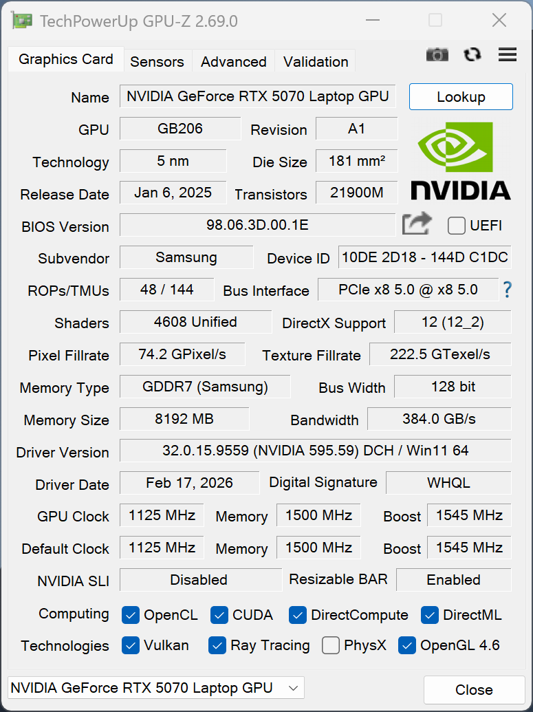 | Samsung Galaxy Book6 Ultra Ultra 7 356H, GeForce RTX 5070 Laptop, Samsung PM9C1b MZVL81T0HFLB-00BH1, OLED, 2880x1800, 16" | Apple MacBook Pro 16 2024 M4 Pro M4 Pro 14-Core, M4 Pro 20-Core GPU, Apple SSD AP2048Z, Mini-LED, 3456x2234, 16.2" | Lenovo Yoga Pro 9i 16 RTX 5070 Ultra 9 285H, GeForce RTX 5070 Laptop, WD PC SN7100S SDFPMSL-1T00-1101, OLED, 3200x2000, 16" | Asus ProArt P16 RTX 5090 Ryzen AI 9 HX 370, GeForce RTX 5090 Laptop, Micron 2500 2TB MTFDKBA2T0QGN-1BN1AABGA, OLED, 3840x2400, 16" | Dell 16 Premium DA16250 Ultra 7 255H, GeForce RTX 5070 Laptop, Kioxia BG6 KBG6AZNV1T02, OLED, 3840x2400, 16.3" | Lenovo ThinkPad T1g Gen 8 21TD003GE Ultra 9 285H, GeForce RTX 5070 Laptop, Samsung PM9E1 MZVLC2T0HBLD, Tandem-OLED, 3200x2000, 16" | Gemiddeld NVIDIA GeForce RTX 5070 Laptop | Gemiddelde van klas Multimedia | |