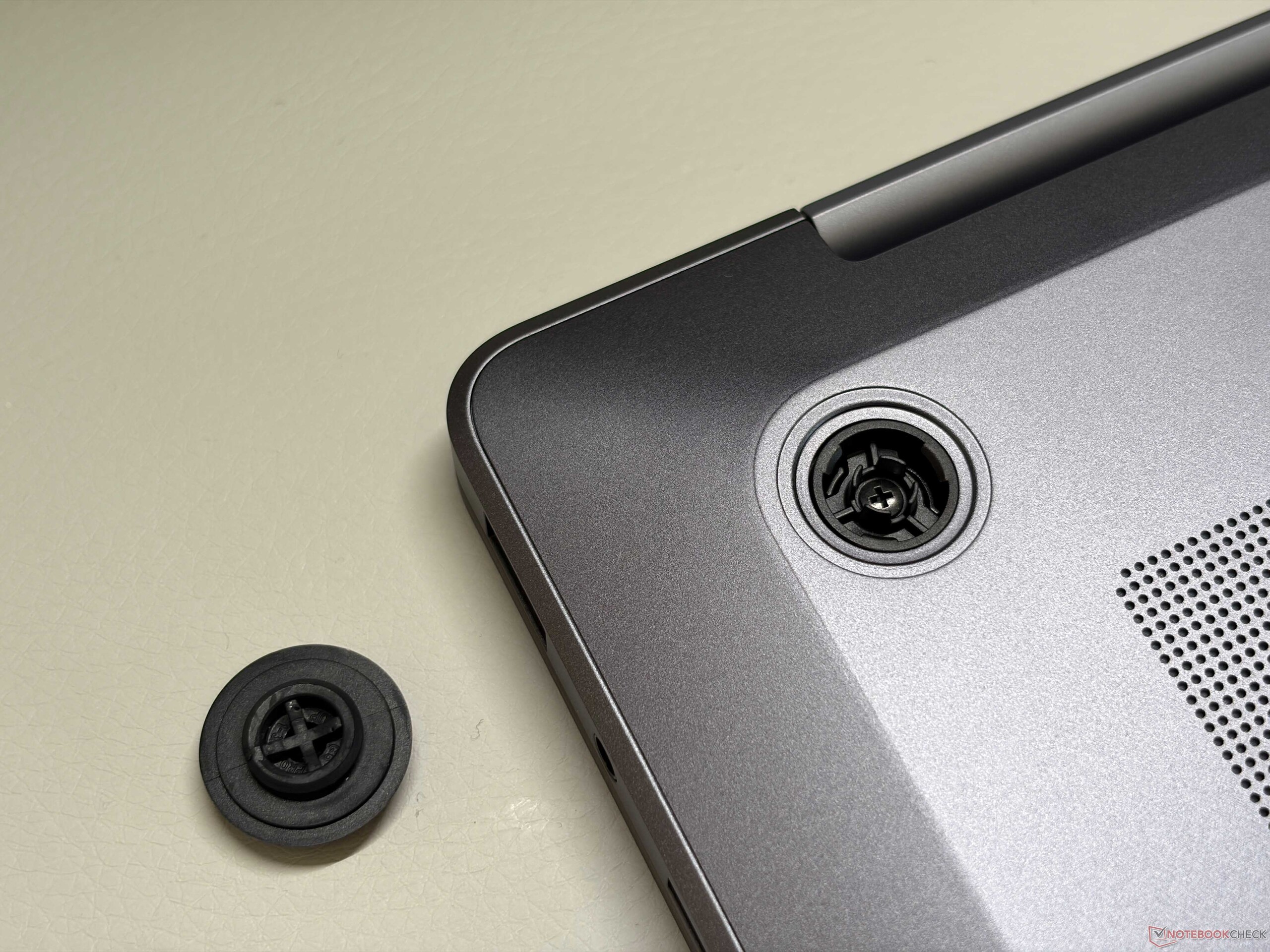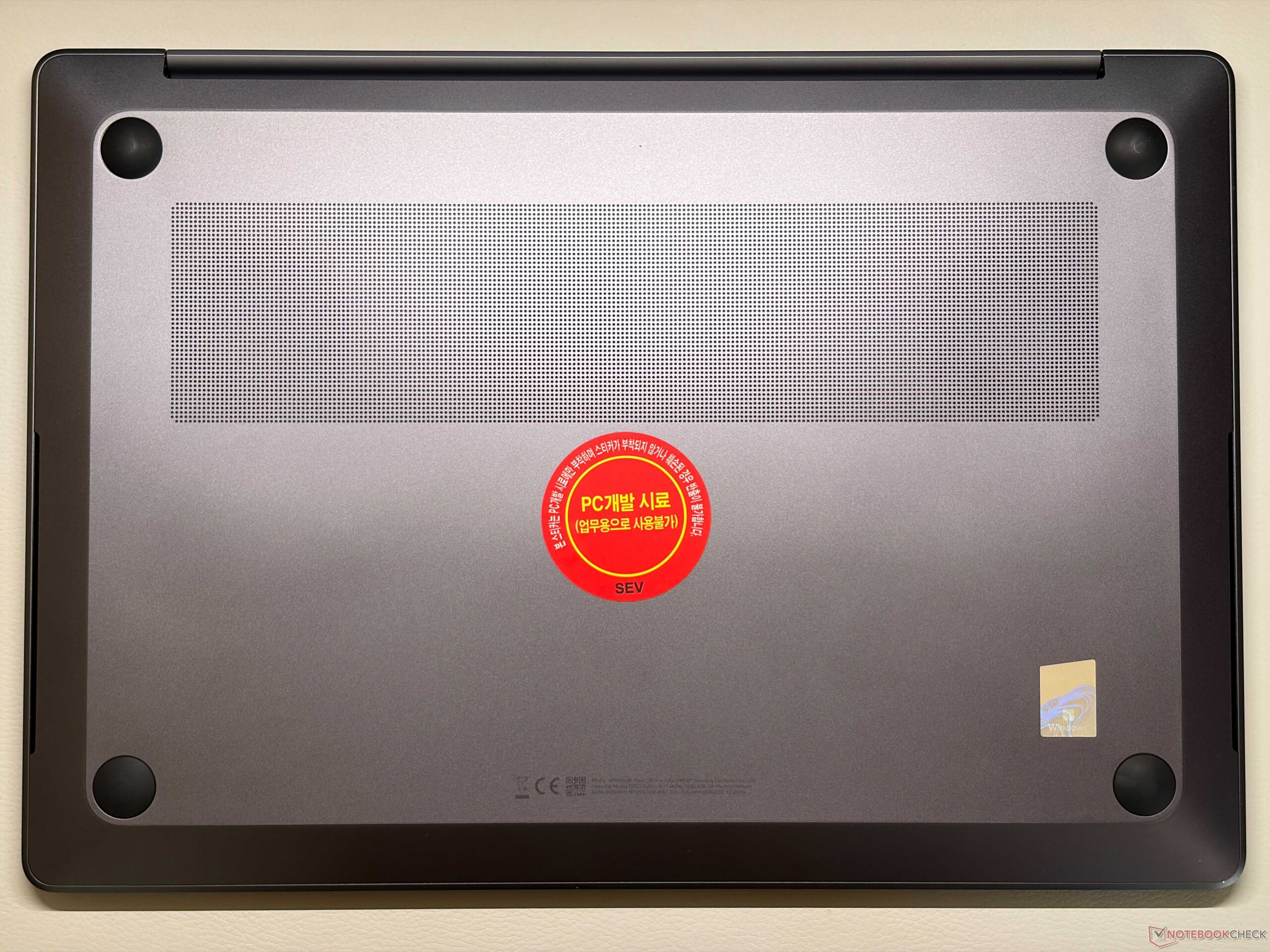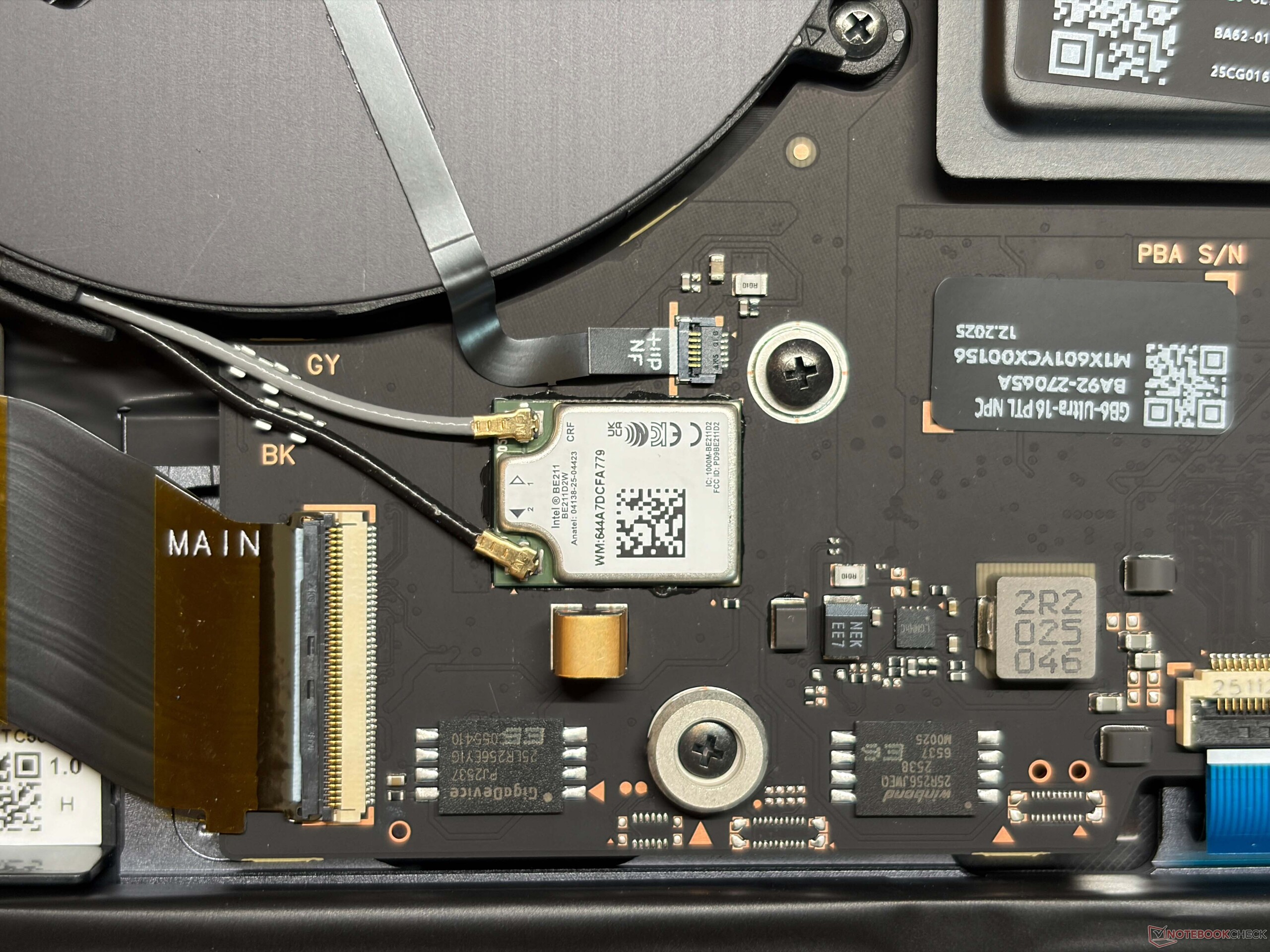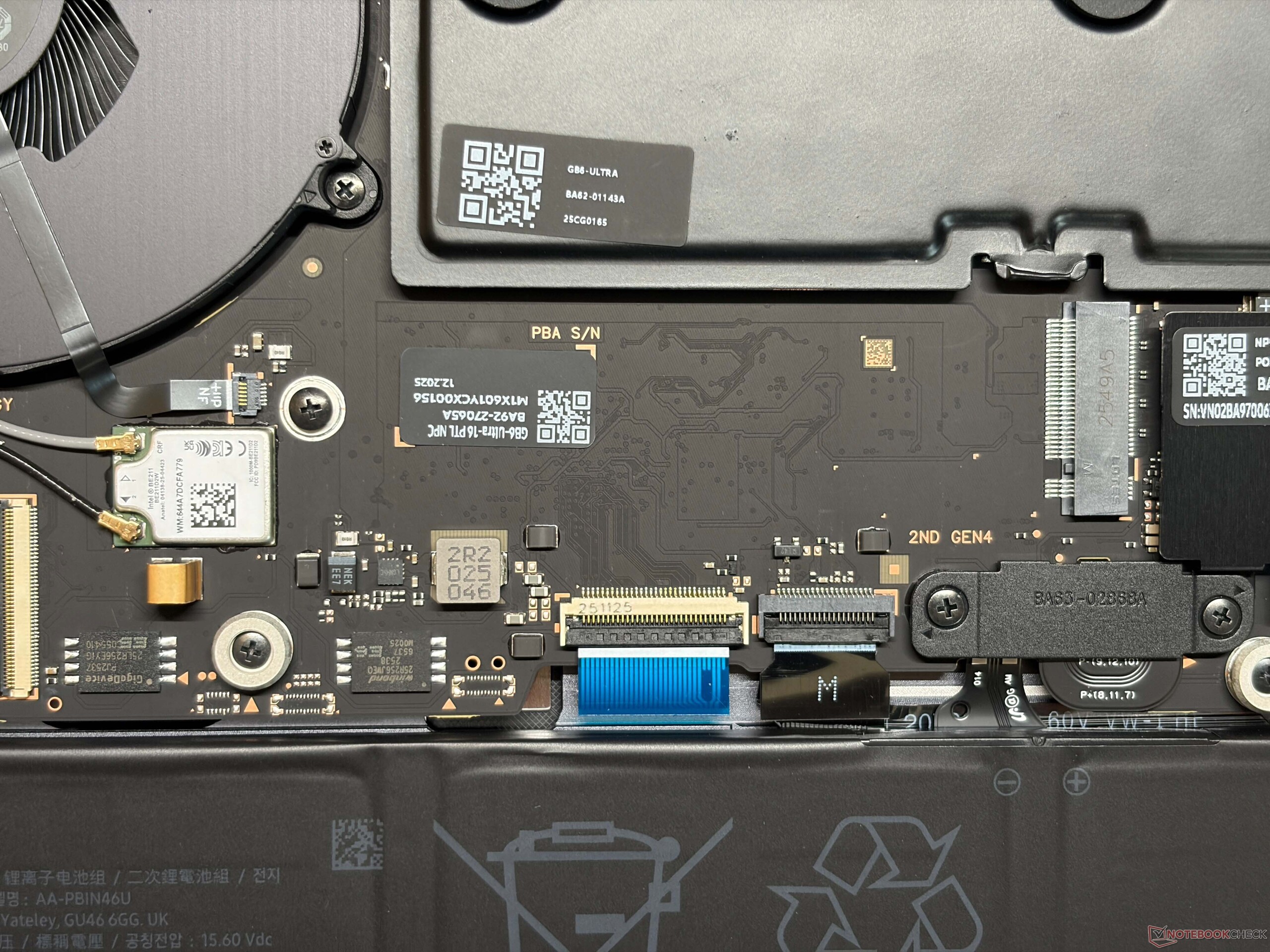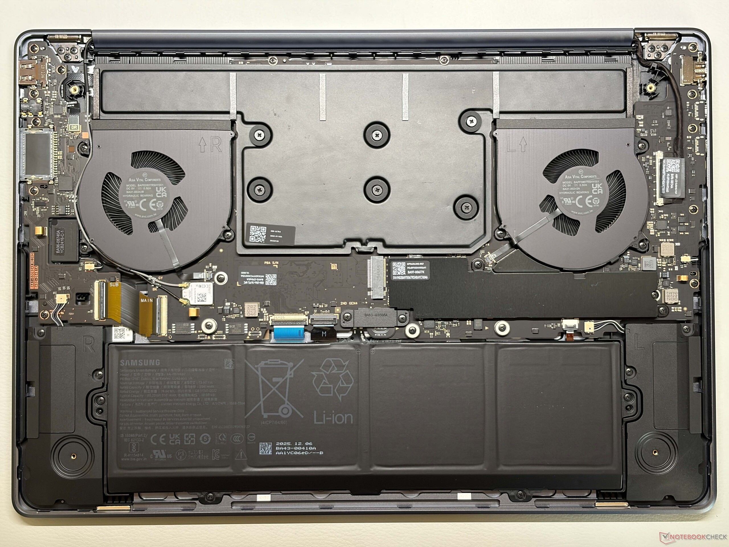 Samsung heeft het vorige ontwerp met de wigvormige basiseenheid (die nog steeds wordt gebruikt voor de andere Galaxy Book6-modellen) overboord gegooid en de nieuwe Galaxy Book6 Ultra ziet er veel meer uit als een MacBook Pro 16 en voelt er ook zo aan. We zijn er vrij zeker van dat veel gebruikers moeite zouden hebben om de twee modellen van elkaar te onderscheiden als je de logo's zou verwijderen. De algehele kwaliteit van de Galaxy Book6 Ultra met het aluminium chassis is uitstekend, zowel wat betreft stabiliteit als bouwkwaliteit. Vingerafdrukken zijn echter een probleem en de oppervlakken zijn niet gemakkelijk schoon te maken. We zijn niet tevreden over de scharnieren (maximale openingshoek ~135 graden), omdat het scherm nogal wiebelt. De onderste rand is ook erg dik. U kunt het onderpaneel verwijderen en toegang krijgen tot de beide SSD-sleuven, de batterij en de ventilatoren, maar het geheugen en de Wi-Fi-module kunnen niet worden vervangen.