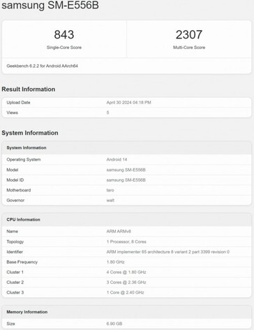 De "F55" heeft zelfs een modelnummer dat er sterk op lijkt: SM-E556Bdie nu ook op Geekbench is verschenen als een aankomende smartphone met de Snapdragon 7 Gen 1 processor, 8GB RAM en een Android 14-gebaseerde SoC.
