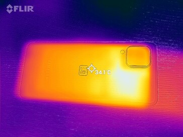 De Galaxy smartphone wordt zeker warm wanneer hij langdurig wordt belast: We hebben temperaturen tot 42,9 °C (109 °F) op de achterkant gemeten. Dat is op zich niet problematisch, maar het is wel merkbaar. De smartphone zal echter heter worden in omgevingen met hogere omgevingstemperaturen.