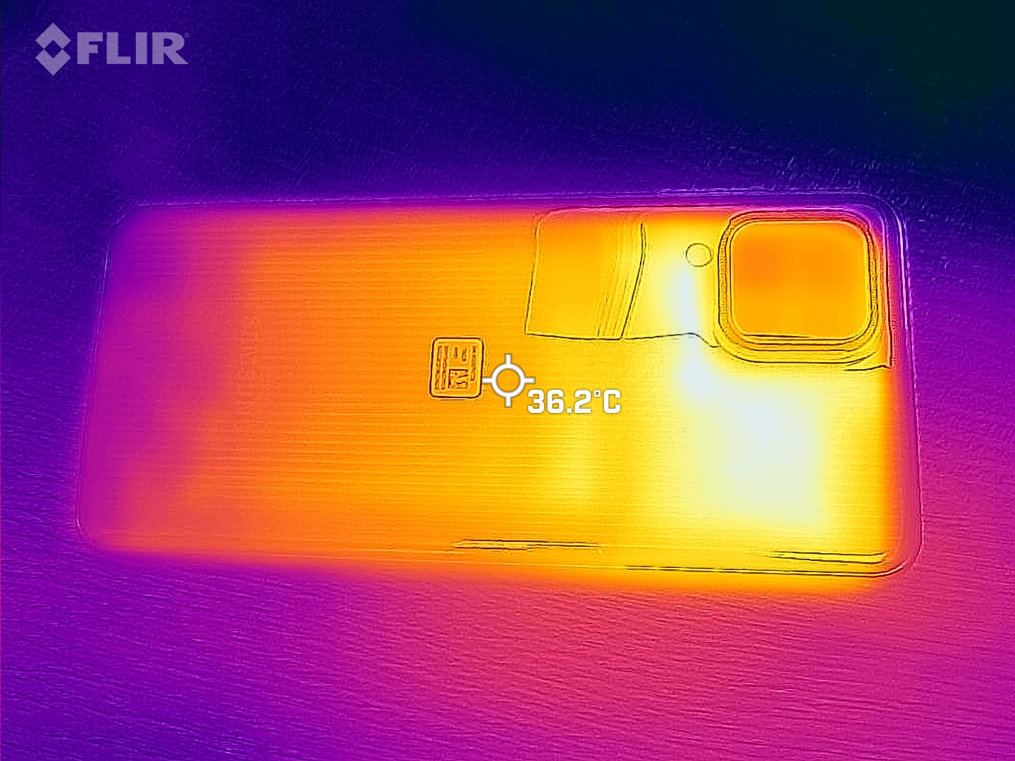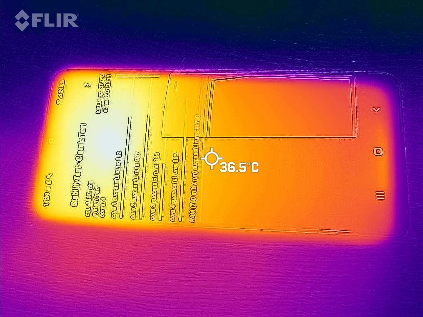 Onder langere belasting kan de Samsung smartphone soms behoorlijk warm worden, en we meten 43,5 °C (110,3 °F) aan de onderkant als maximumtemperatuur. Hoewel dit merkbaar is, is het niet problematisch. Wie de smartphone echter vaak meeneemt naar omgevingen met hogere temperaturen, moet er rekening mee houden dat de warmteontwikkeling van de smartphone onder belasting kritiek kan worden