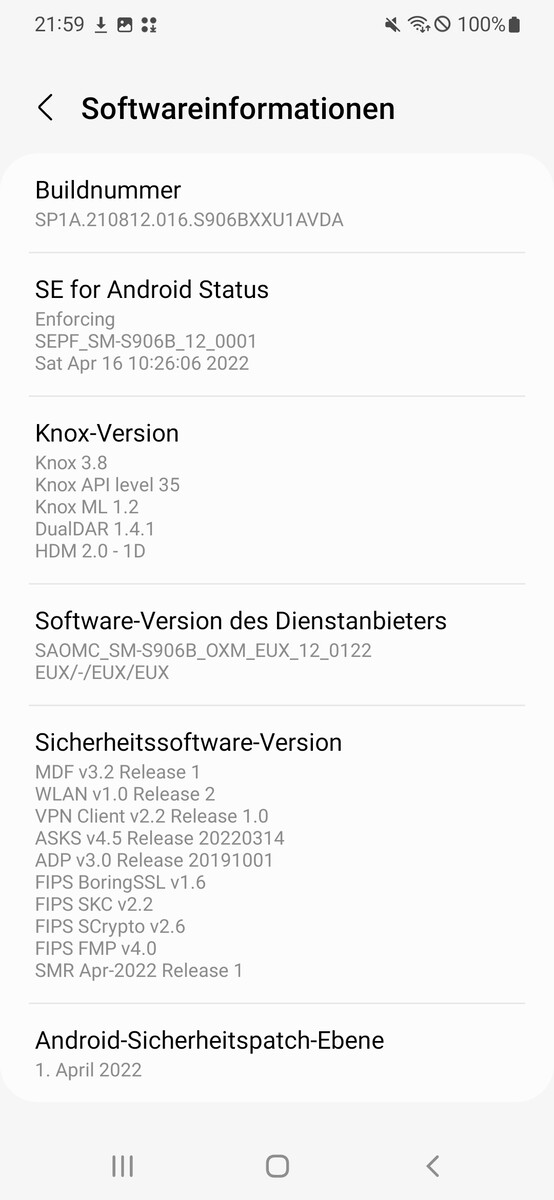De Galaxy S22+ draait op Android 12 en de One UI 4.1 interface van de fabrikant zelf. Op het moment van testen (medio april) waren de Android beveiligingspatches van 01 april - actueler dan dit wordt het niet.