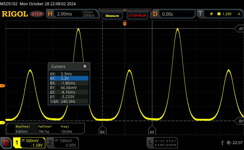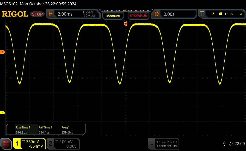 Unfortunately, Samsung hasn't provided its Fan Edition with eye-friendly PWM dimming. Due to its built-in OLED technology, the Galaxy S24 FE uses low-frequency PWM to control the screen brightness. We measured a low but consistent 240 Hz with an oscilloscope.