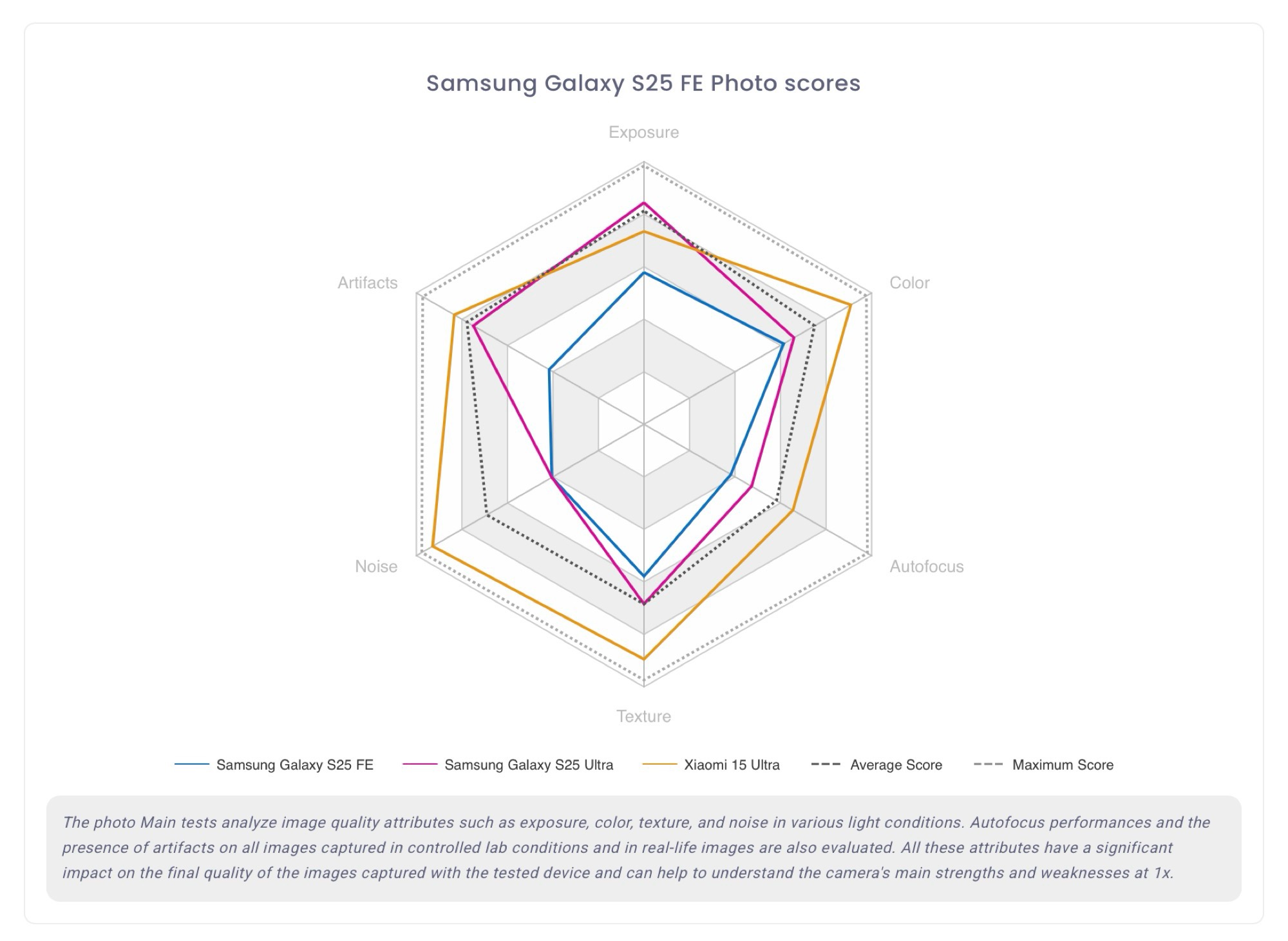 Het gebruik van de portretmodus met bokeh-simulatie leidde tot een merkbaar verlies van details in het hele beeld. Onaangename artefacten kwamen ook vaak voor bij het vastleggen van bewegende onderwerpen. Volgens DxOMark kunnen mensen die op zoek zijn naar een camerasysteem van hoge kwaliteit voor een gemiddelde prijs beter de Xiaomi 15, Google Pixel 10 of Xiaomi 14T kopen in plaats van de Samsung Galaxy S25 FE