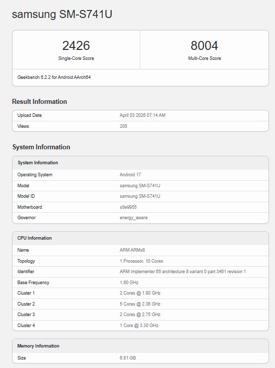 De telefoon wordt vermeld met het modelnummer "SM-S741U", heeft 8 GB RAM aan boord en draait op Android 17. Qua prestaties behaalt het toestel een single-core score van 2.426 en een multi-core score van 8.004. Beide cijfers zijn een stap terug ten opzichte van de prestaties van de andere telefoons uit de Galaxy S26 serie telefoons. Dat is geen verrassing, want de chipset op het geteste toestel lijkt de Exynos 2500en niet de Exynos 2600 op sommige Galaxy S26-modellen.