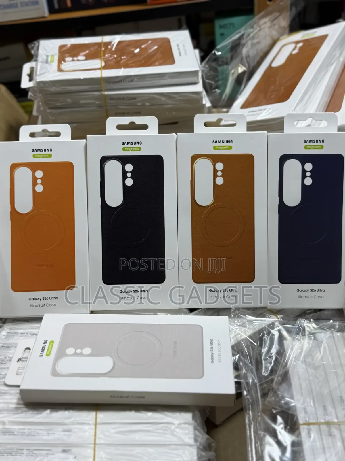 Zelfs de officiële hoesjes van Samsung zijn al verkrijgbaar bij sommige retailers, zoals blijkt uit talloze foto's op sociale media. Vooral de Kindsuit case, met zijn imitatieleren uiterlijk, lijkt in grote hoeveelheden te worden verzonden en zal in minstens vijf kleuren verkrijgbaar zijn. Het woord "Magnetic" is duidelijk zichtbaar op de verpakking