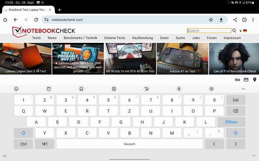 Samsung gebruikt het Samsung-toetsenbord af-fabriek voor de Galaxy Tab S9. Hierdoor is het mogelijk om zonder problemen gegevens in te voeren op het apparaat in zowel liggende als staande modus en zonder foutieve invoer. Het touchscreen maakt indruk met zijn voorbeeldige bruikbaarheid: de glijeigenschappen zijn goed, net als de mogelijke bedieningssnelheid. Invoer wordt in alle gebieden van het touchscreen herkend.
