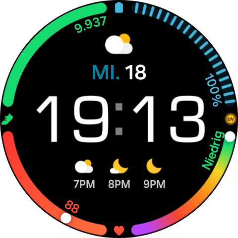 Activiteitsdoelen, zoals stappen, tijd in beweging en verbrande calorieën, worden weergegeven in een hartgrafiek. De streefwaarden kunnen naar wens worden aangepast in de Gezondheid-app. De Watch7 kan ook stressniveaus en AEG's meten.