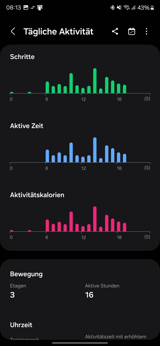 De gegevens die door de Galaxy Watch7 worden verzameld, worden niet in de Wear-app opgeslagen; hiervoor moet de Samsung Health-app uit de PlayStore worden gedownload. De gegevens voor stappen, hartslag, slaapwaarden, training, ECG en bloeddruk en de samenstelling van het lichaam wat betreft spiermassa, vet en water worden verzameld in het startmenu van de applicatie.