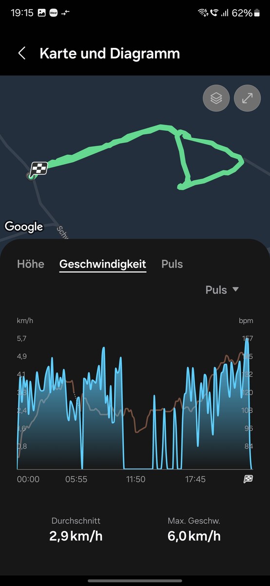 Het resultaat van de GPS-registratie van de Galaxy smartwatch is zeer overtuigend. De gemeten afstand van de twee horloges verschilt slechts marginaal en de weergave van de afgelegde route vertoont slechts kleine verschillen.
