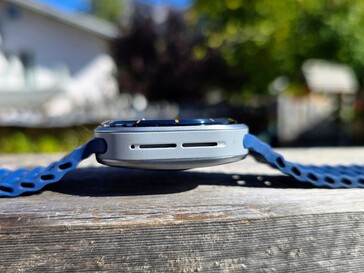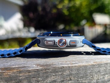 De Watch Ultra is het grootste model in de smartwatchreeks van Samsung. Met een diameter van 47 millimeter is hij het breedst - en vooral in vergelijking met de Watch8valt de aanzienlijke dikte op. Het lompe uiterlijk wordt verder benadrukt door een bandje van 24 mm met een dubbele sluiting.