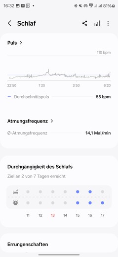 De slaaptracking van de Galaxy Watch Ultimate is uitgebreid. De software geeft de totale slaaptijd weer en de slaap wordt opgesplitst in lichte, diepe en REM-slaap. Waakfases worden ook betrouwbaar gedetecteerd. De app geeft het verloop van de fasen grafisch weer, maar toont ook de tijden en percentages van de totale slaap. Typische waarden worden ter vergelijking gegeven.