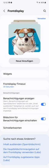 Opnieuw kan het externe scherm verschillende widgets weergeven - een gebied waarin de Flip zich nauwelijks onderscheidt van zijn voorganger. Aangepaste apps kunnen ook worden gebruikt. De functie moet echter eerst worden geactiveerd onder Labs, en de lijst blijft erg onvolledig.