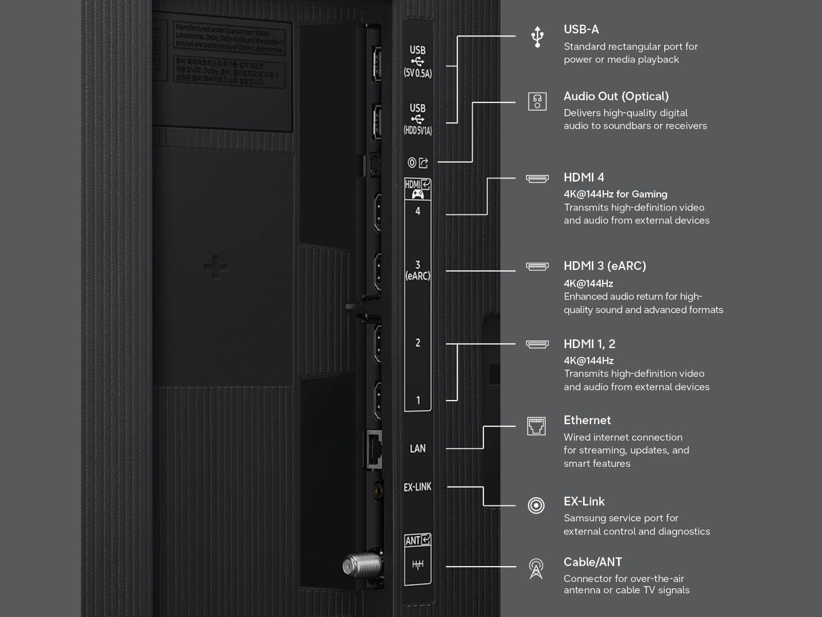 De hardware wordt aangedreven door de nieuwe Micro RGB AI Engine Pro. Deze processor zorgt voor realtime beeldverbeteringen zoals de AI Motion Enhancer Pro, die ontworpen is om snel bewegende objecten in sport en gaming scherper te maken. Het bevat ook een Color Booster Pro om scènes met doffere tinten "intelligent" te verzadigen. Het vlaggenschip, de R95H, die eerder dit jaar aangekondigd op CES, krijgt Samsung's Glare Free technologie, die een matte afwerking gebruikt om reflecties te verminderen en beelddiepte te behouden in lichte kamers.
