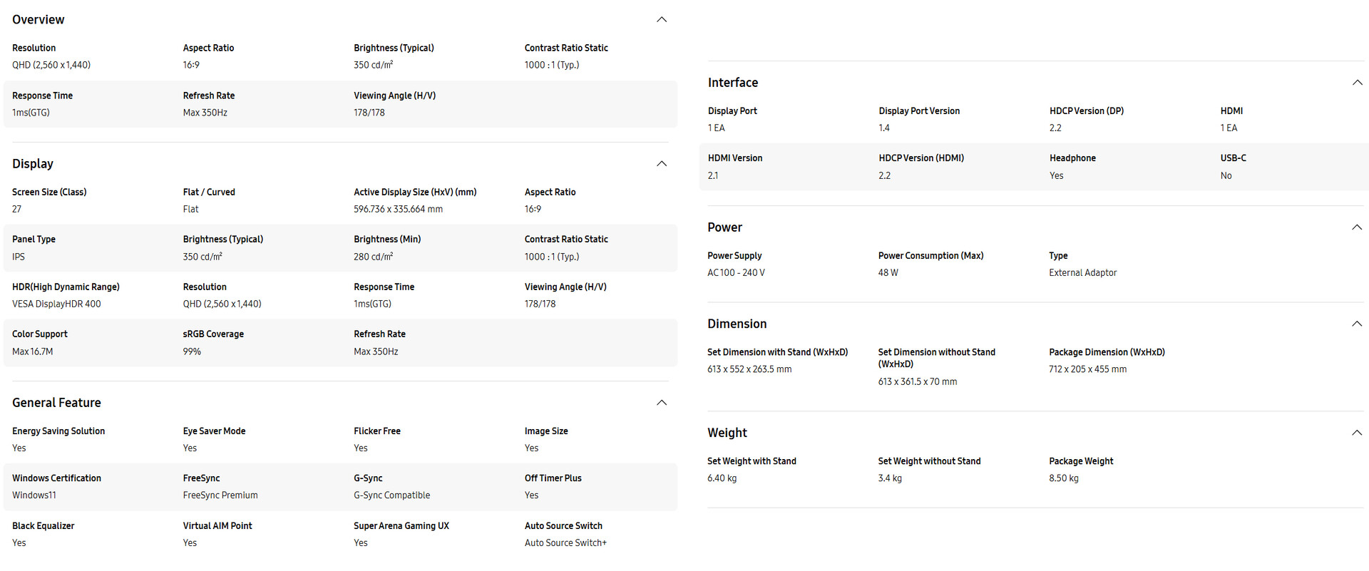 Wat betreft de specificaties is hij identiek aan het Chinese model. Om precies te zijn heeft het een 27 inch Fast IPS-paneel met een resolutie van 1440p. Een van de hoogtepunten van het scherm is de vernieuwingsfrequentie van 350 Hz. In combinatie met de 1 ms GtG responstijd zou de Odyssey G60F een responsieve ervaring moeten bieden.