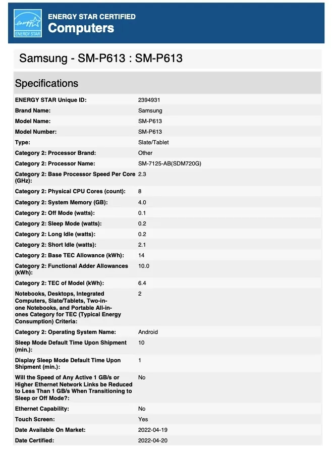 Zoals de onderstaande screenshots laten zien, heeft Samsung SM-P613 en SM-P619 toegevoegd aan zijn ondersteuningsdatabase, zij het zonder enige specificaties te vermelden. De SM-P619 is echter al opgedoken opGeekbenchenHTML5testmet Android 12 en een Snapdragon 720G en 4 GB RAM. Bovendien,EnergyStarnaar SM-P613 als een SM7125 SoC, het onderdeelnummer voor deSnapdragon 720G.