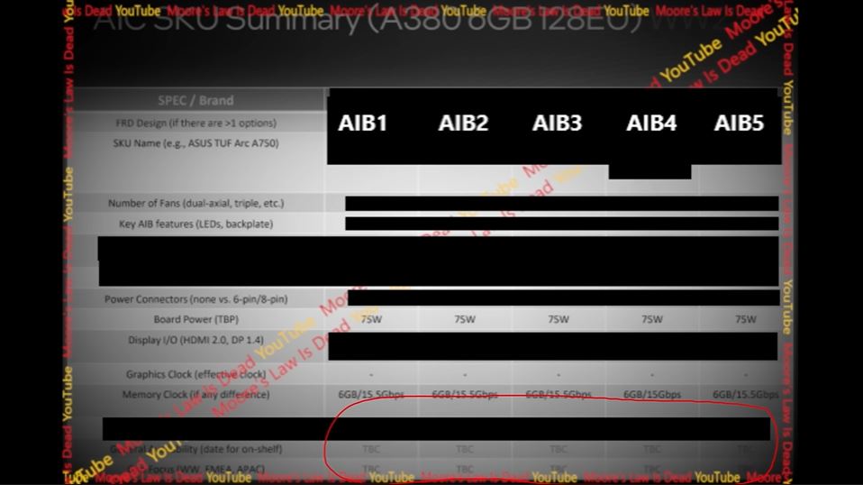 Om de beweringen van de AIB bronnen kracht bij te zetten, toont de leaker een slide met de vermelding "TBC", als de datum voor on-shelf AIB Arc A380 of A750 borden.