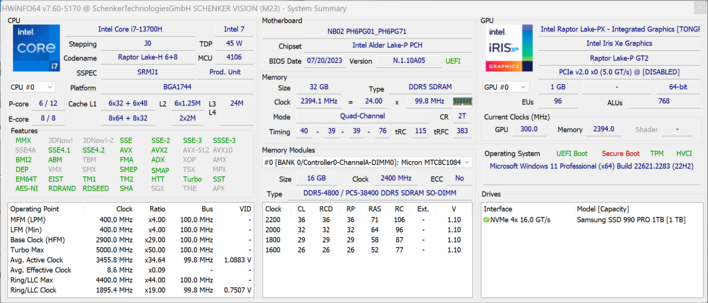 | Schenker Vision 14 2023 Iris Xe G7 96EUs, i7-13700H, Samsung 990 Pro 1 TB | LG Gram Style 14Z90RS-G.AD7AG Iris Xe G7 96EUs, i7-1360P, SK hynix PC801 HFS001TEJ9X101N | Asus ZenBook 14X UX3404VC Iris Xe G7 96EUs, i9-13900H, Micron 2450 1TB MTFDKBA1T0TFK | Lenovo Yoga Pro 7 14ARP G8 Radeon 680M, R7 7735HS, Samsung PM9A1 MZVL21T0HCLR | Lenovo Yoga Pro 7 14IRH G8 GeForce RTX 4050 Laptop GPU, i7-13700H, Samsung PM9A1 MZVL21T0HCLR | Samsung Galaxy Book3 Pro 14 Iris Xe G7 96EUs, i7-1360P, WD PC SN740 512GB SDDPMQD-512G-1101 | Schenker Vision 14 2022 RTX 3050 Ti GeForce RTX 3050 Ti Laptop GPU, i7-12700H, Samsung SSD 980 Pro 1TB MZ-V8P1T0BW | |