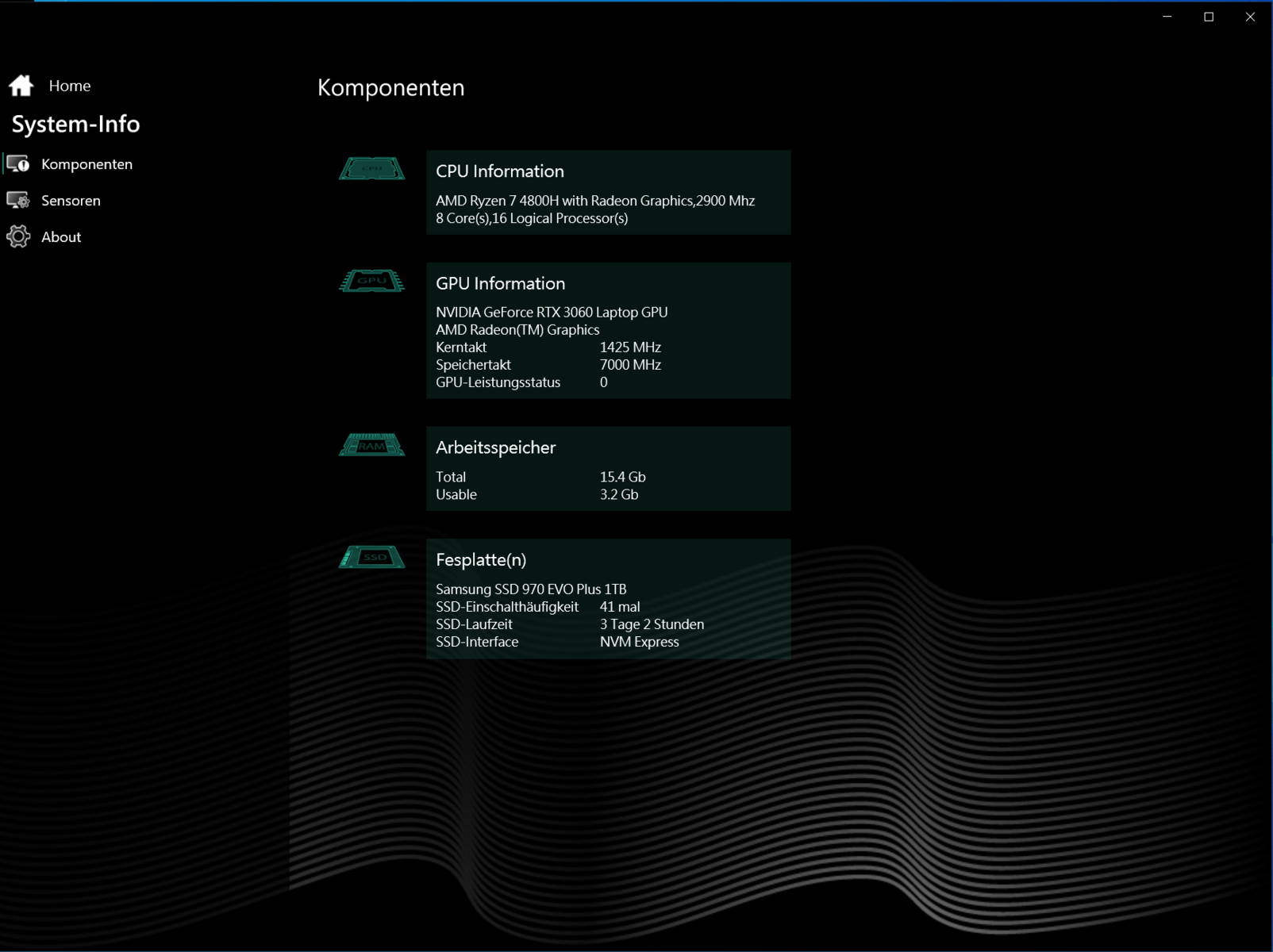 | Schenker XMG Core 15 Ampere R7 4800H, GeForce RTX 3060 Laptop GPU, 62 Wh | Asus TUF Dash F15 FX516PR i7-11370H, GeForce RTX 3070 Laptop GPU, 76 Wh | Aorus 15G XC i7-10870H, GeForce RTX 3070 Laptop GPU, 99 Wh | HP Omen 15-en0375ng R7 4800H, GeForce RTX 2060 Mobile, 70.9 Wh | Acer Predator Triton 300 PT315-52-79LP i7-10750H, GeForce RTX 2060 Mobile, 58.7 Wh | Schenker XMG Core 15 GK5NR0O R7 4800H, GeForce RTX 2060 Mobile, 62 Wh | Gemiddelde van klas Gaming | |
