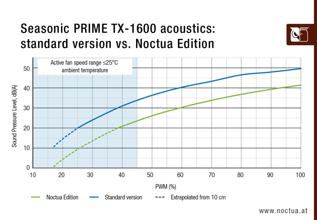 In een persbericht stelt Noctua dat het zijn populaire casefan heeft aangevuld met een 'custom engineered fan grill'. Naar verluidt kan de Noctua Edition hierdoor ~8-10dB(A) stiller draaien dan de standaard Prime TX-1600. Zie Noctua's afbeeldingen hieronder en het speciale artikel op https://noctua.at/en/what-makes-the-seasonic-prime-tx-1600-noctua-edition-so-quiet voor hoe deze veranderingen ook de luchtstroom beïnvloeden.