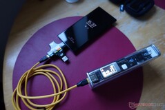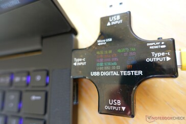 De DC-poort werkt ook als ingang, zij het ongeveer half zo snel (~44W) als die van de 100W USB type-C poort - ook moet worden opgemerkt dat het een 5,5x2,5mm ingang is, waarvoor mijn voeding een adapter nodig had - maar goed dat ik er een in de buurt had.