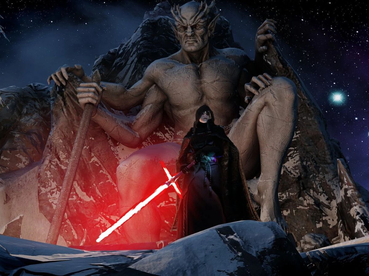 "De Sith zijn aangekomen in Skyrim. Heeft een holocron gevonden en leert nu de weg van de Force. Deze heeft net zijn eerste lichtzwaard gebouwd en moest het uittesten.Deze bedankt de Trolls voor hun vrijwilligerswerk als tribuut, ahem onderzoeksvrijwilligers."