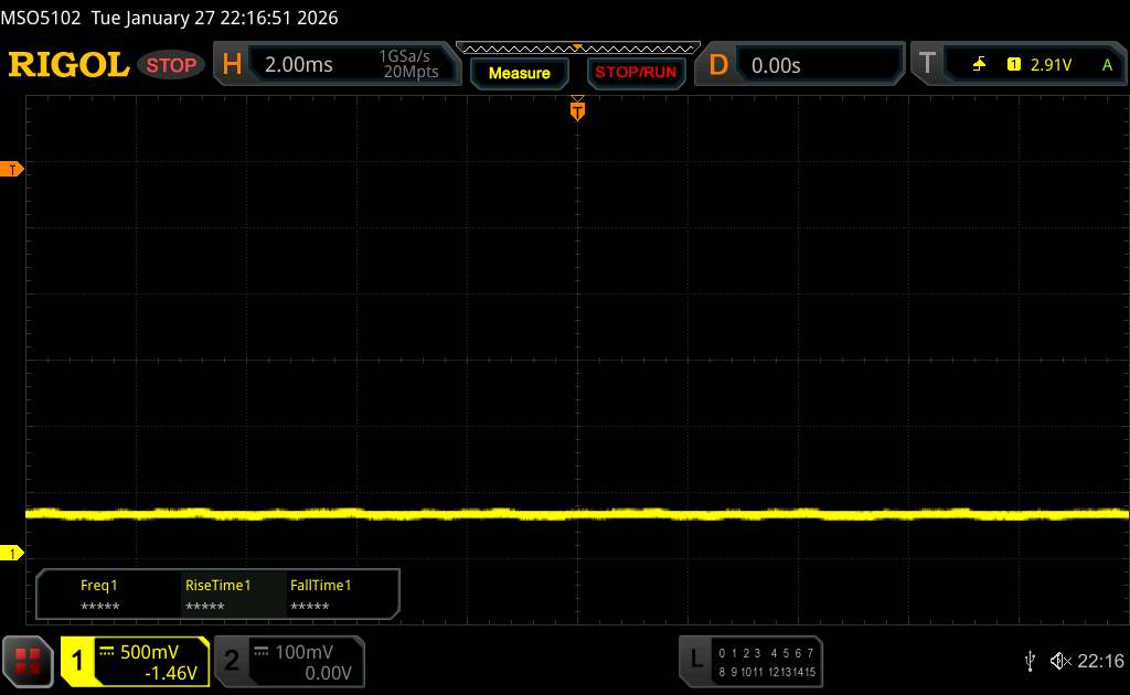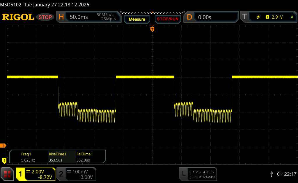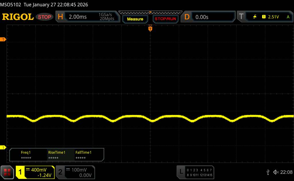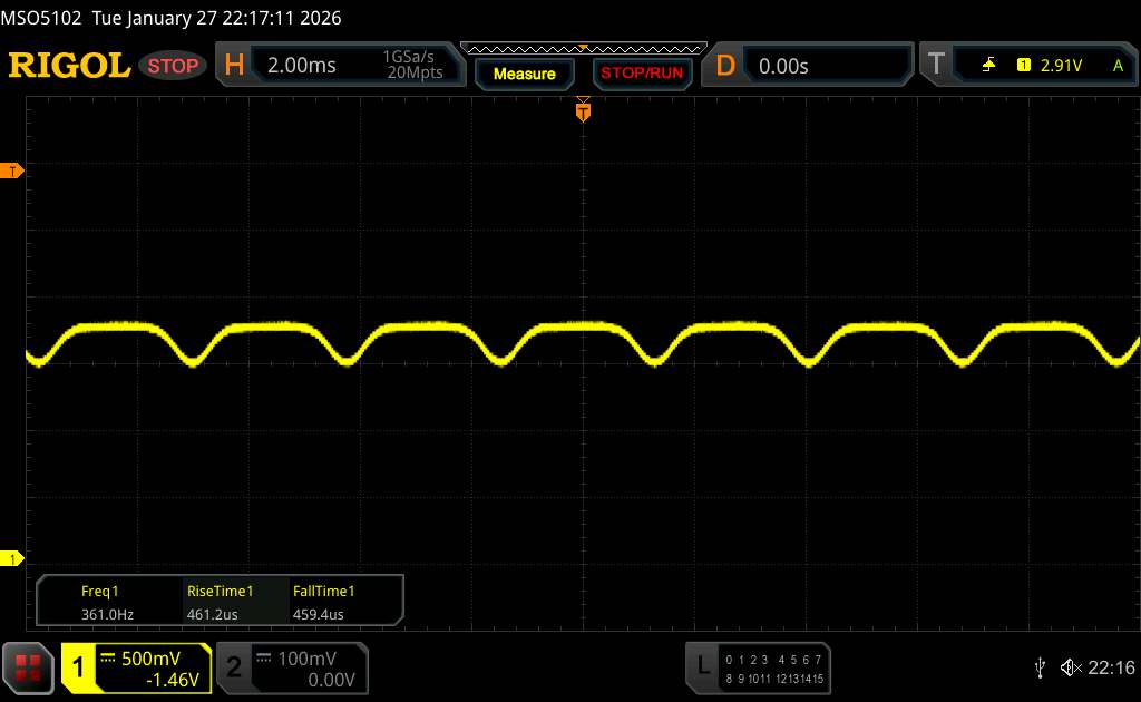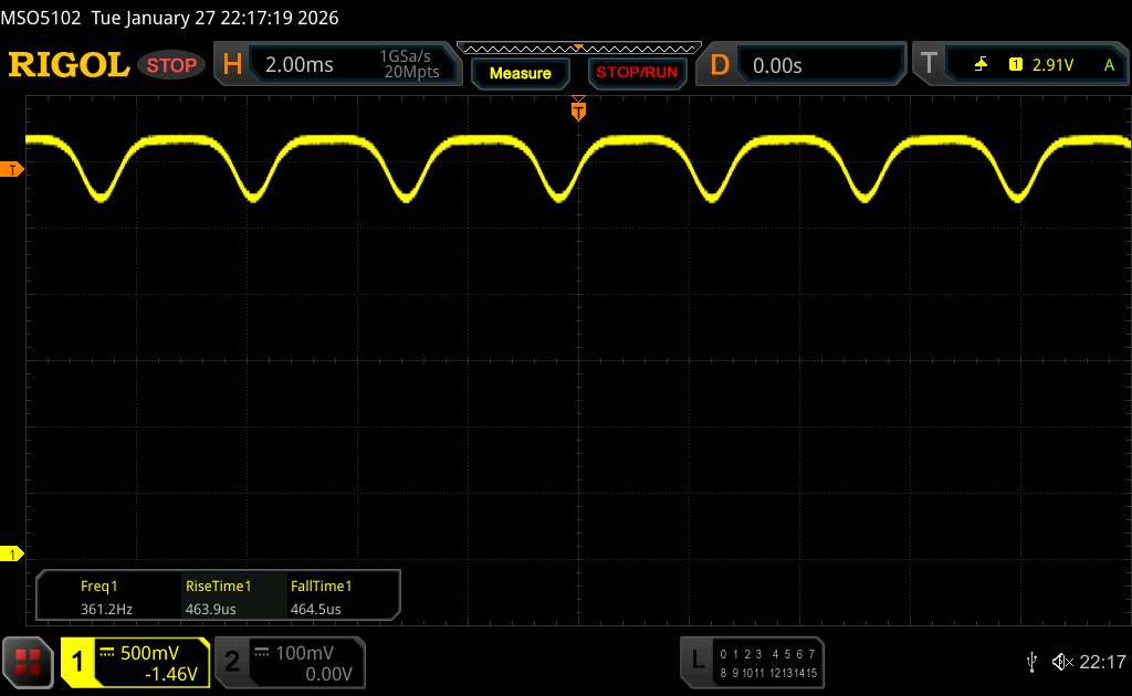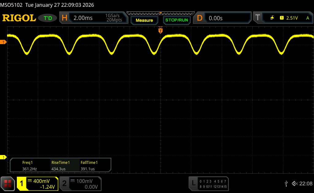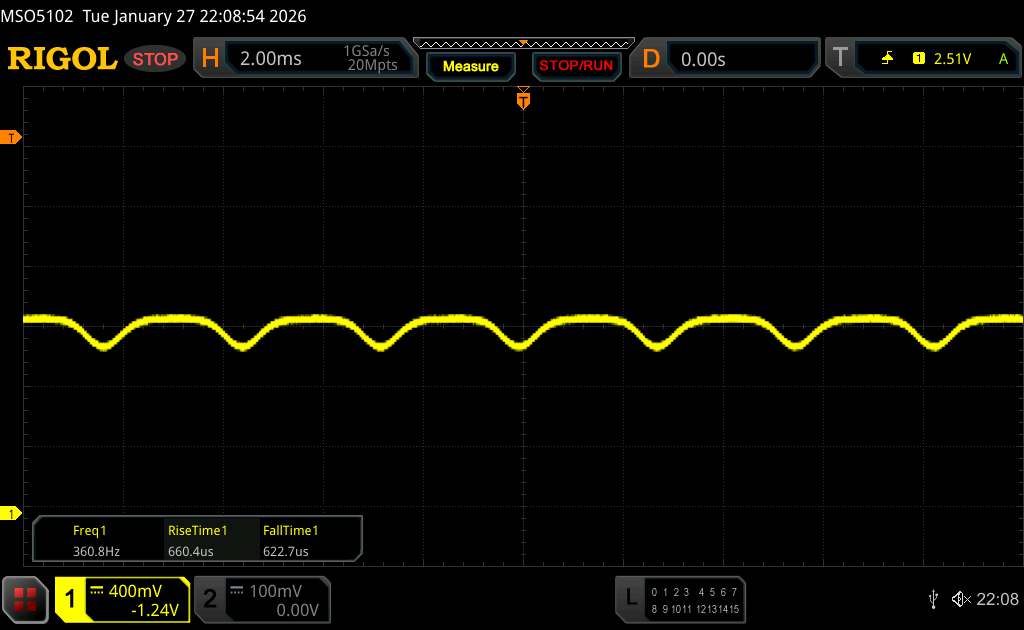 Met de oscilloscoop hebben we een basisfrequentie van 360 Hz gemeten. Er wordt echter ook hoogfrequent PWM-dimmen van meer dan 1.500 Hz gebruikt, dus eventuele gezondheidseffecten voor gevoelige gebruikers zouden beperkt moeten blijven.