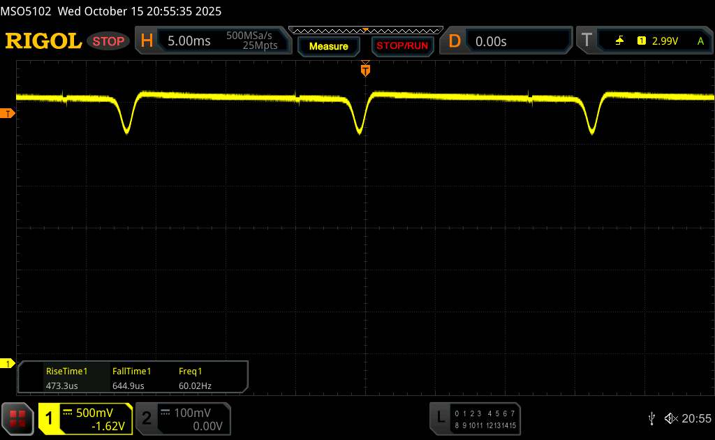 Zoals verwacht van een OLED-paneel, flikkert het scherm bij slechts 60 Hz onder de oscilloscoop. Tecno verzacht dit met een ondiepe amplitudecurve en hoogfrequent PWM-dimmen. Bij minimale helderheid hebben we 2.000 Hz gemeten. Hoewel gevoeligheidsproblemen niet volledig kunnen worden uitgesloten, zijn ze onwaarschijnlijk.