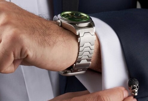 Het bandje is verkrijgbaar in drie versies: roestvrij staal in zilver of zwart, of titanium in grijs. Dankzij een nauwelijks zichtbare snelsluiting op de bovenste schakel kan de band met één enkele beweging worden geopend. De lengte kan worden aangepast door schakels te verwijderen of toe te voegen met behulp van het meegeleverde gereedschap. Met een gewicht tussen de 60 en 100 gram, afhankelijk van het materiaal en de lengte, is de band vrij zwaar en het gewicht neemt nog verder toe als er twee horloges aan vastzitten. Het tweede horloge kan indien gewenst vervangen worden door een conventionele sluiting
