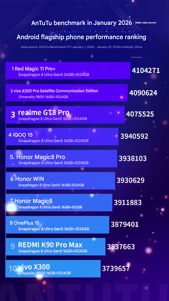 - De RedMagic 11 Pro+ met Snapdragon 8 Elite Gen 5 staat op de eerste plaats met een gemiddelde van 4.104.271 punten.