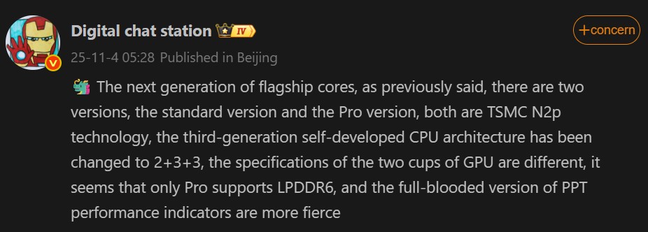 DCS stelt dat de twee nieuwe mobiele processors allebei gebruik zullen maken van dezelfde derde-generatie architectuur. Ze zullen ook gebruik maken van hetzelfde TSMC N2P fabricageproces. De Pro zal echter zwaardere specificaties hebben, waaronder een hogere GPU-capaciteit en ondersteuning voor LPDDR6-geheugen.