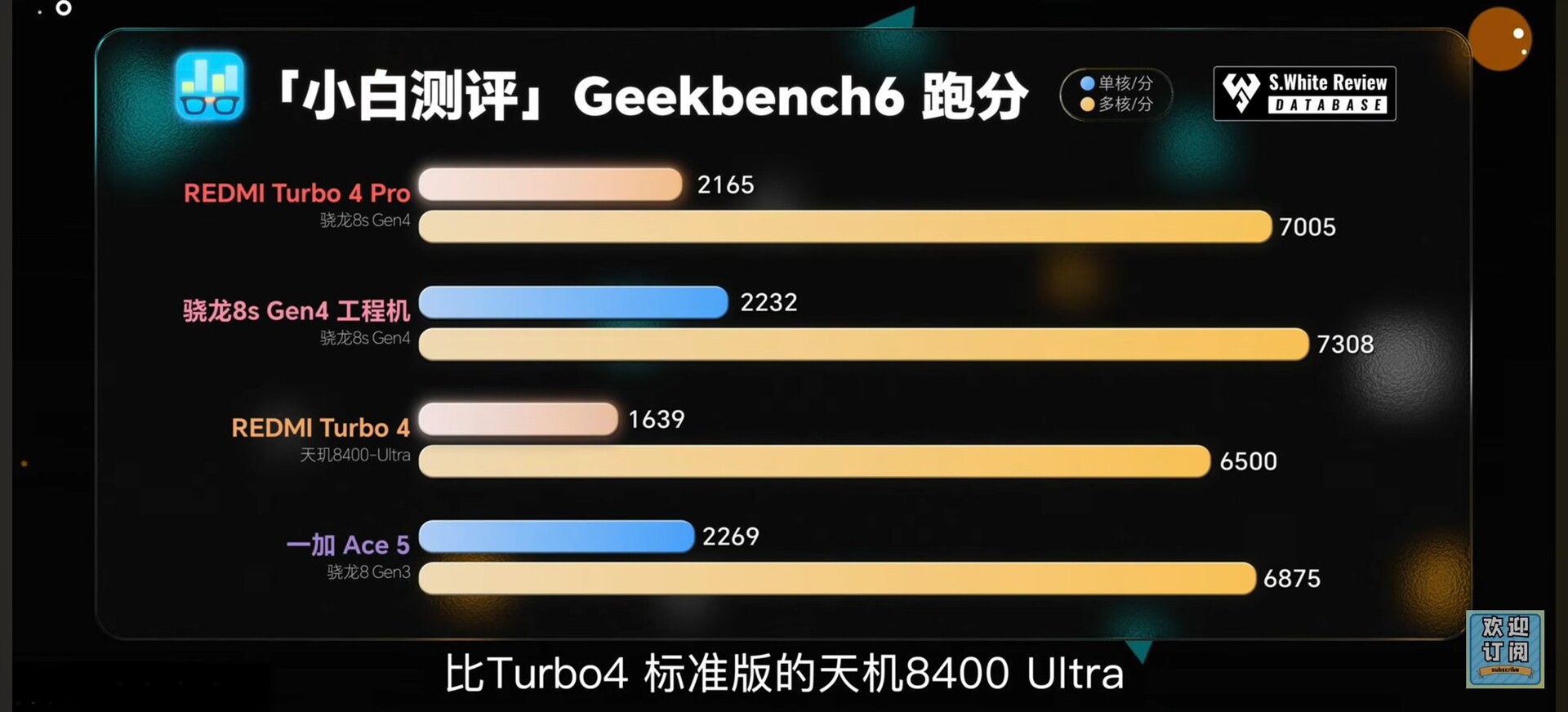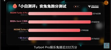 Zoals beoordeeld door Xiaobai's Tech Reviews, behaalt de Redmi Turbo 4 Pro een single-core score van 2.165 op Geekbench 6, en een multi-core score van 7.005. Op AnTuTu haalt de telefoon een totaalscore van 2.216.228. Aan de GPU-kant behaalt de Redmi Turbo 4 Pro een score van 4.619 op de WildLife Extreme-test van 3DMark.