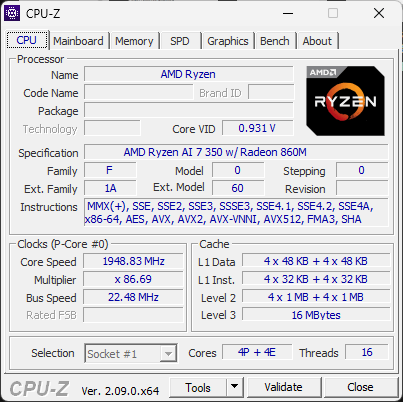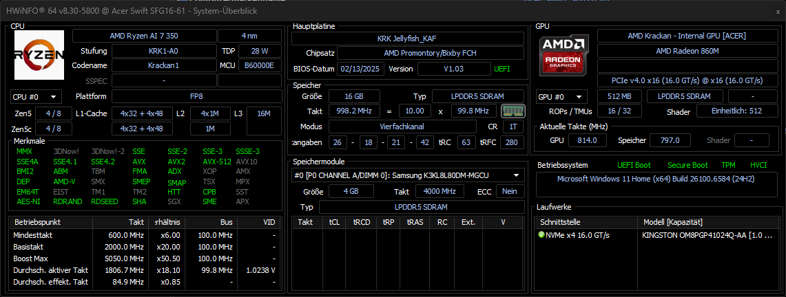 Acer biedt verschillende hardwareconfiguraties voor de Swift Go AI. Ons testapparaat is uitgerust met de AMD Ryzen AI 7 350-processor, vergezeld van 16 GB RAM, wat enigszins beperkt lijkt gezien de krachtige processor.