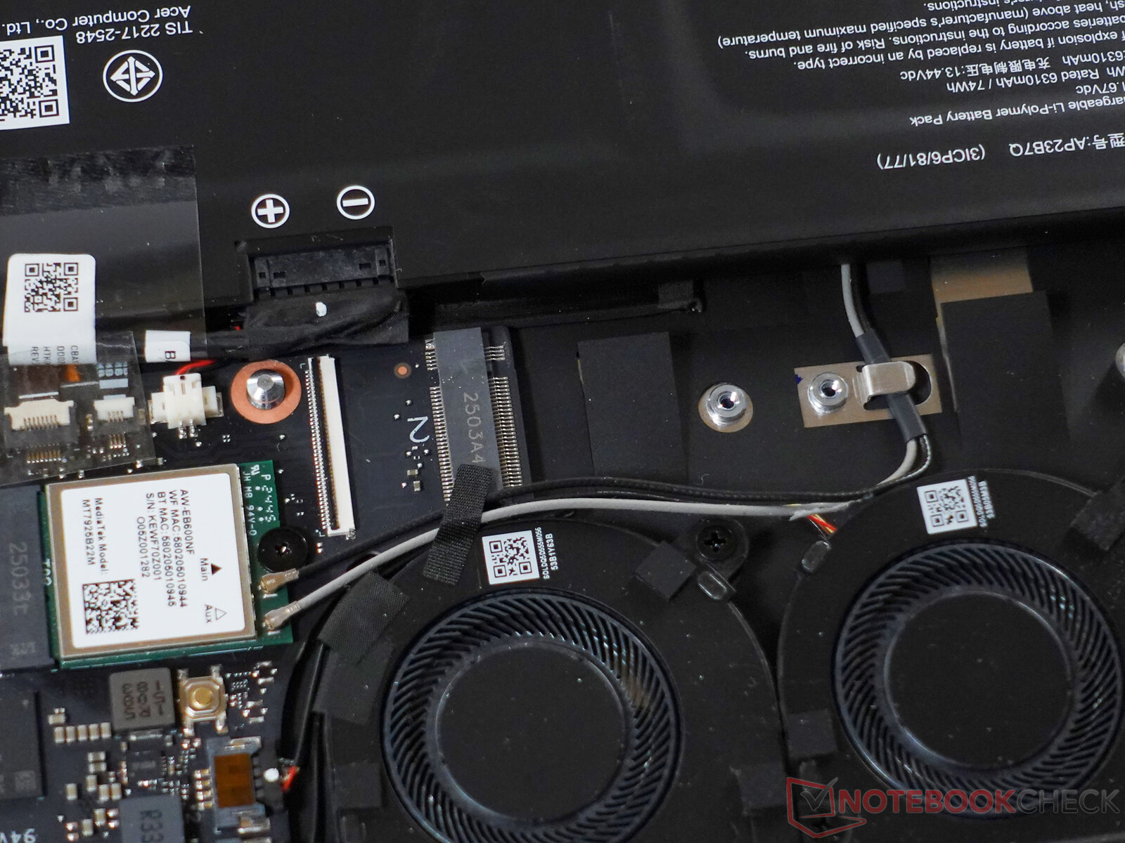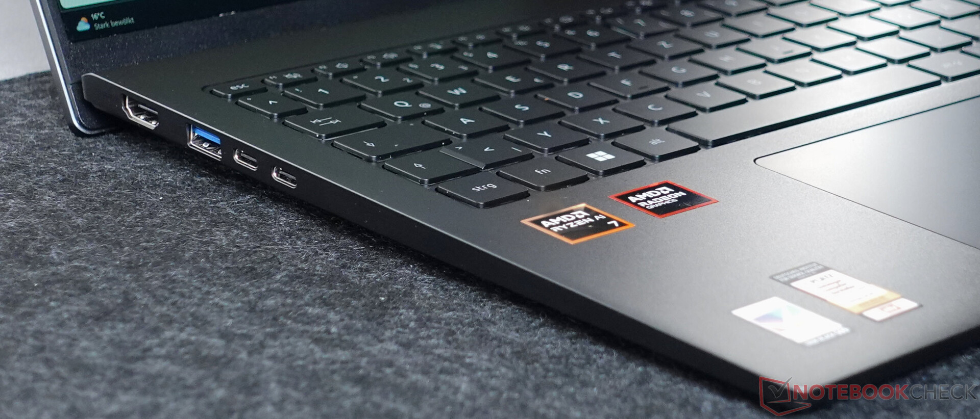 De 2.5K webcam in zijn kleine uitsteeksel op het beeldscherm produceert goede beelden. Stabiele Wi-Fi-connectiviteit wordt gegarandeerd door een MediaTek-module met Wi-Fi 7. Aan de linkerkant van de laptop zijn de meeste aansluitingen geconcentreerd. Hier zijn ook twee USB-4 poorten aanwezig.