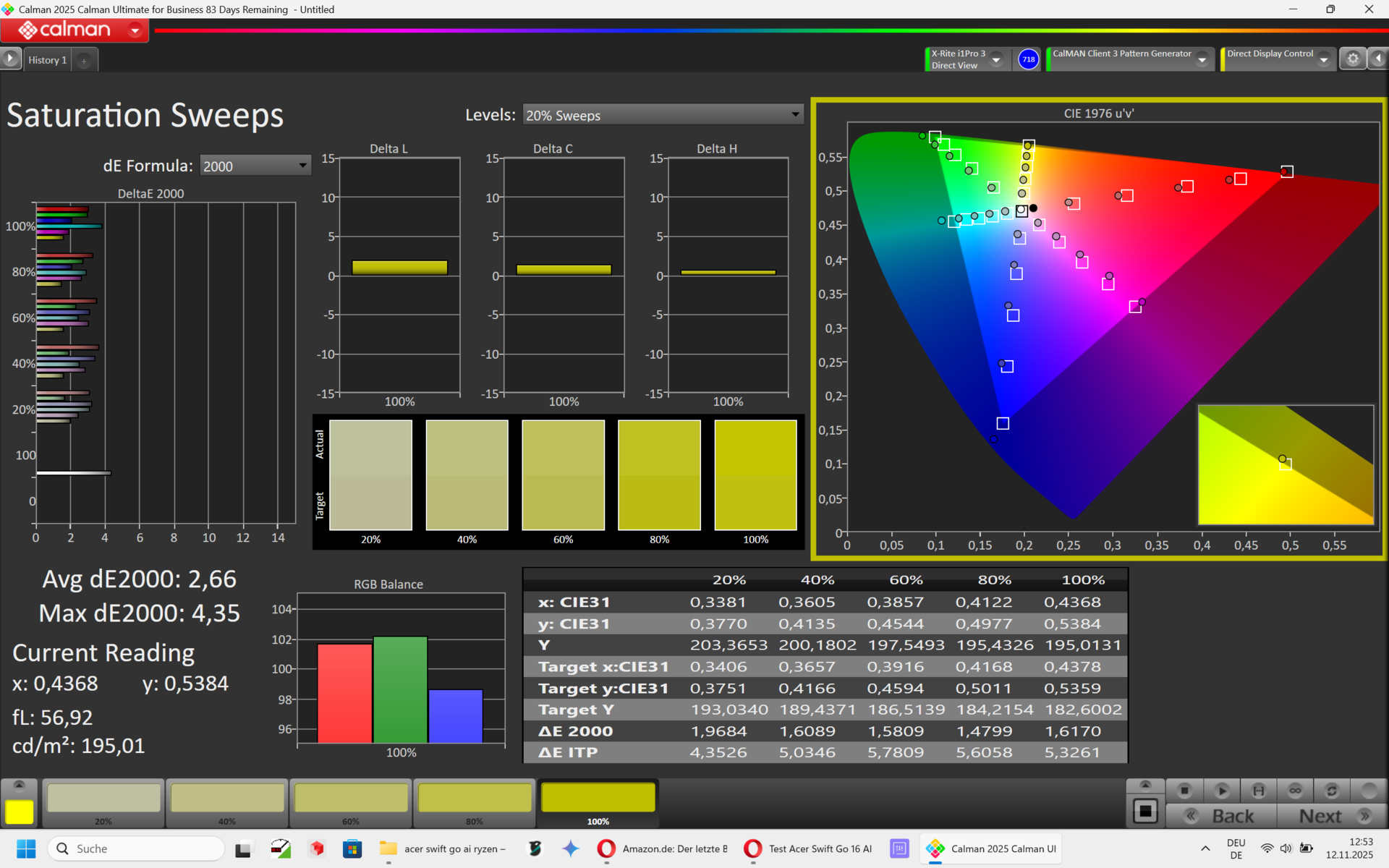 Voor ontwerpers is de dekking van het kleurengamma van cruciaal belang: Het beeldscherm dekt bijna de volledige Display P3 kleurruimte. De kleurnauwkeurigheid uit de doos is al opmerkelijk goed en vereist weinig kalibratie. Flikkeren tijdens beeldverversing is een kenmerk van OLED panelen. Dit gebeurt hier met een frequentie van 220 tot 250 Hz.