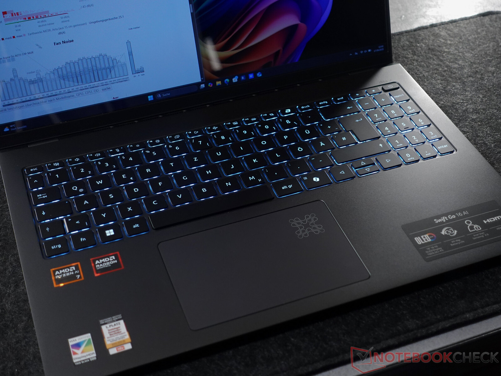 Het toetsenbord van de Swift Go 16 AI heeft een volledige indeling, inclusief een speciaal cijferblok. Achtergrondverlichting en mooie, goed gedefinieerde drukpunten zijn kenmerkend voor deze toetsen. Het ruim bemeten touchpad werkt nauwkeurig. Als speciale functie geeft het via subtiele lichteffecten aan wanneer de NPU (Neural Processing Unit) van de processor of andere AI-functies actief worden gebruikt.