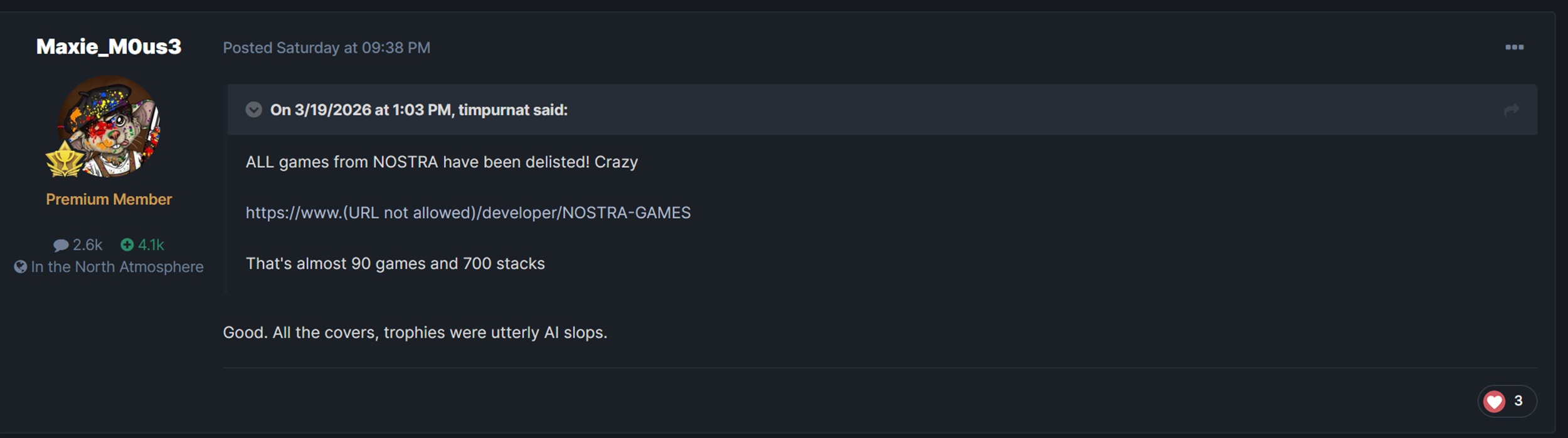 Als we rekening houden met regionale verschillen, zag Nostra Games 700 games verdwijnen. Zoals de site Delisted Games site meldt, reageerde het bedrijf op het nieuws op Discord. Het bevestigde dat het geen waarschuwing vooraf had gehad, maar van plan is om titels te blijven uitbrengen op de Nintendo eShop, Xbox en Steam.
