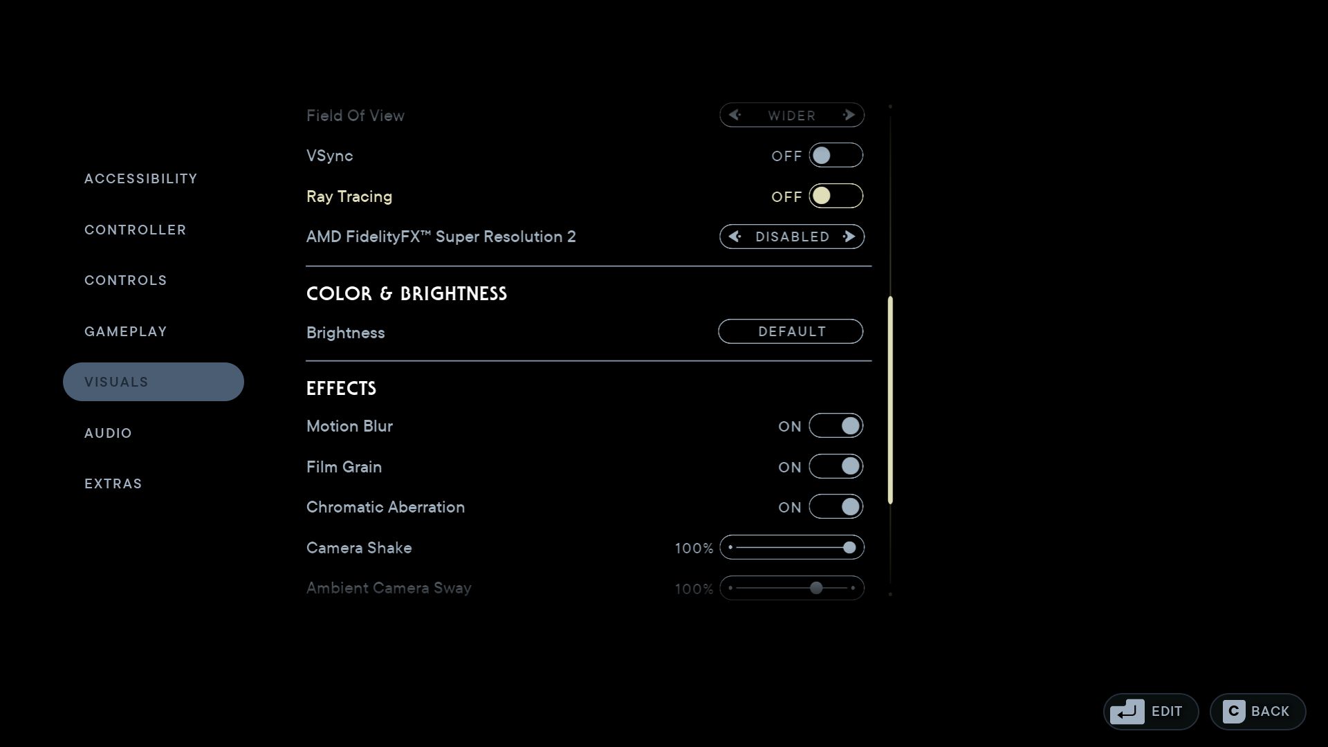 Een ding dat EA (of de ontwikkelaar Respawn) zou kunnen verbeteren is het grafische menu. Enerzijds is het spel ontworpen om gespeeld te worden met een gamepad, dus het gebruik van een muis/toetsenbord blijkt een beetje pietluttig. Aan de andere kant staat er niet eens uitleg bij de afzonderlijke opties (wijzigingen worden tenminste toegepast zonder het spel opnieuw op te starten). Terwijl je in het bovenste gedeelte de resolutie kunt veranderen en de optionele keuze hebt om een preset te selecteren - in het middelste gedeelte zijn er verschillende knoppen voor V-Sync, ray tracing en FSR 2 (DLSS is momenteel niet beschikbaar). De kleur-, effect- en HUD-opties onderaan zouden geen merkbaar effect moeten hebben op de prestaties van het spel.