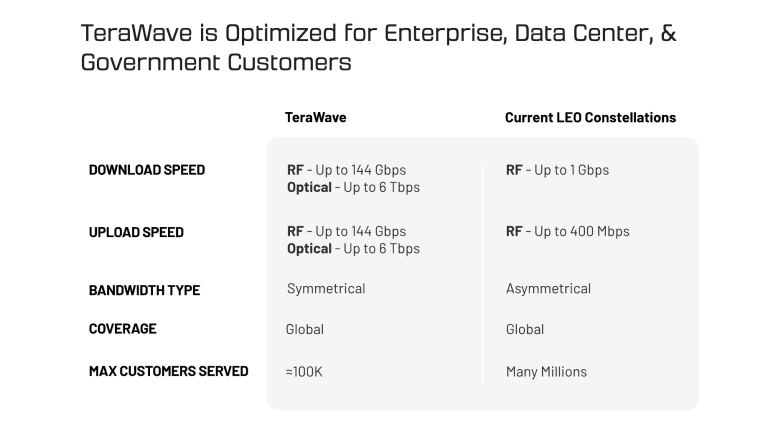 Jeff Bezos' Blue Origin heeft aangekondigd TeraWave aangekondigd, een satellietinternetnetwerk dat ontworpen is om tot 6 terabytes per seconde aan symmetrische bandbreedte te leveren en gericht is op klanten uit het bedrijfsleven, datacenters en de overheid. In tegenstelling tot Starlinkdat miljoenen individuele gebruikers bedient, richt TeraWave zich op een veel kleiner klantenbestand.