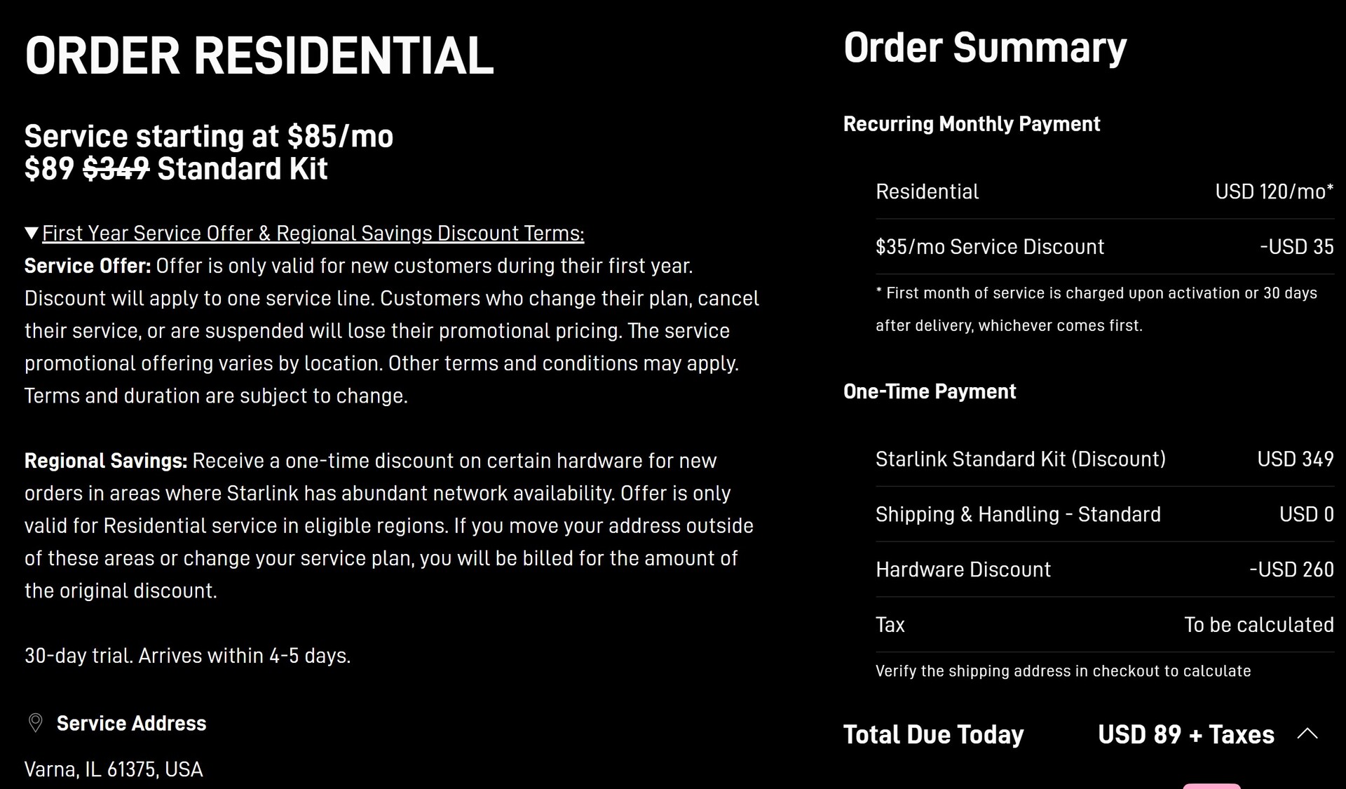 Na een aanmelding met de doorverwijslink krijgt de doorverwijzende Starlink klant een e-mailbevestiging en een gratis servicekrediet binnen 30 dagen na activering van de nieuwe account, geldig voor de volgende factureringsperiode. In bepaalde regio's met weinig dekking in de VS waar Starlink uitvoert een schotel- en servicekortingspromo loopt, kan de satellietinternetservice nu worden gestart voor slechts een eerste uitgave van $89, zoals hieronder te zien is.