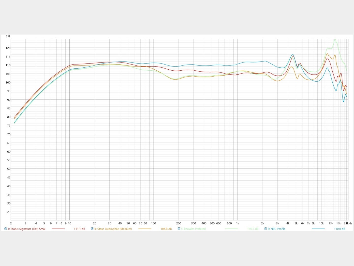 Voor een objectievere analyse hebben we een aantal metingen gedaan met het miniDSP EARS systeem in combinatie met de Room EQ Wizard (REW) analysesoftware, zoals u hieronder kunt zien. De resultaten waren wederom uitstekend. Met de fabrieksinstelling "Status Signature" werden de lage tonen benadrukt, met iets zwakkere middentonen en goed vertegenwoordigde hoge tonen. Er treden echter sterke en ongewenste resonanties op bij 4,5 kHz, 5,6 kHz en boven 10 kHz. Met een aangepaste EQ kunnen de ideale waarden worden benaderd. De meeste gebruikers zullen meer dan tevreden zijn met de standaard EQ, maar liefhebbers zullen blij zijn te weten dat de Status Pro X nog meer potentieel heeft.