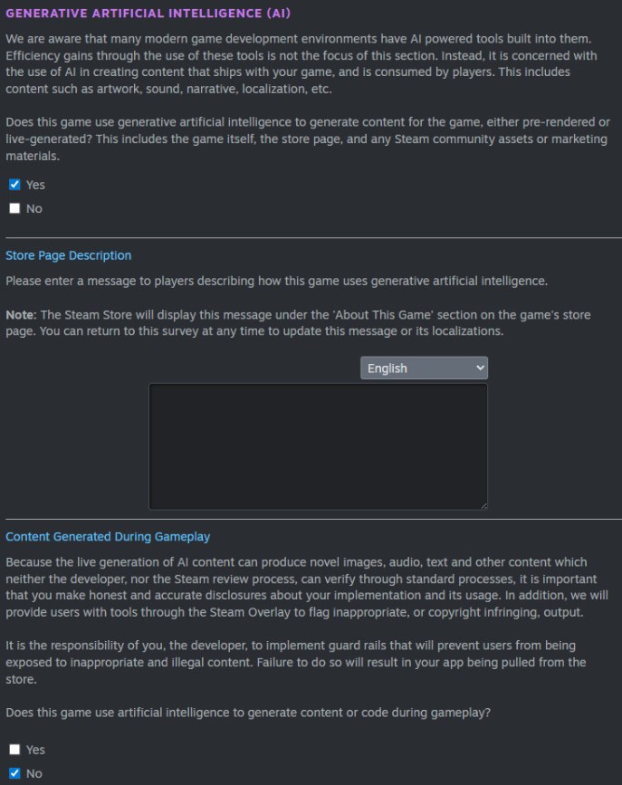 Ten eerste moeten ontwikkelaars bevestigen of generatieve AI wordt gebruikt om inhoud te maken die bij het spel wordt geleverd. Hieronder vallen dingen zoals illustraties, geluid, verhaalelementen, lokalisatie, beschrijvingen van winkelpagina's of zelfs marketingmateriaal. Als een game op deze manier AI gebruikt, moeten ontwikkelaars een kort bericht schrijven waarin wordt uitgelegd hoe het wordt gebruikt. Dit bericht wordt openbaar weergegeven op de Steam-winkelpagina van het spel onder het gedeelte "Over dit spel" en kan op elk moment worden bijgewerkt.